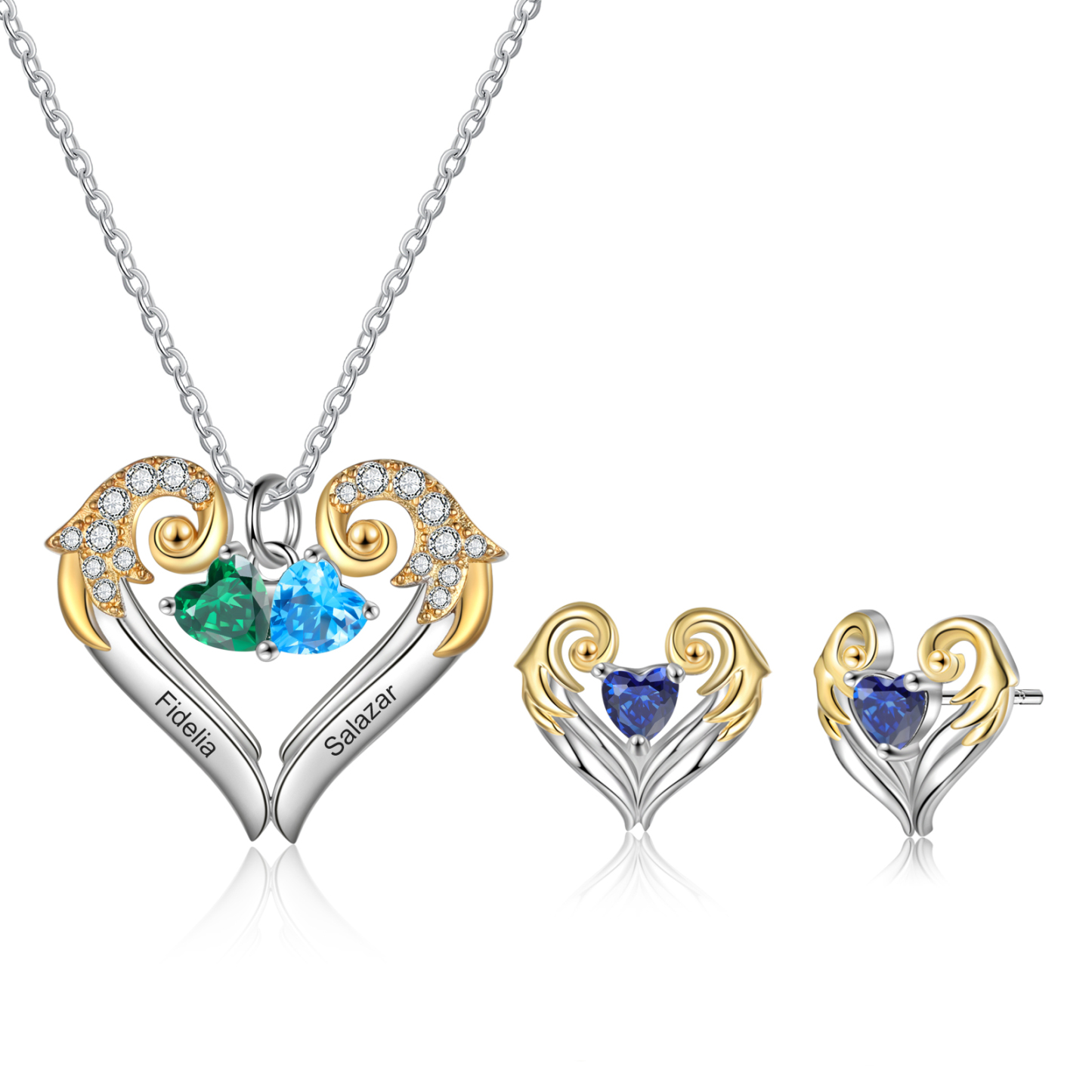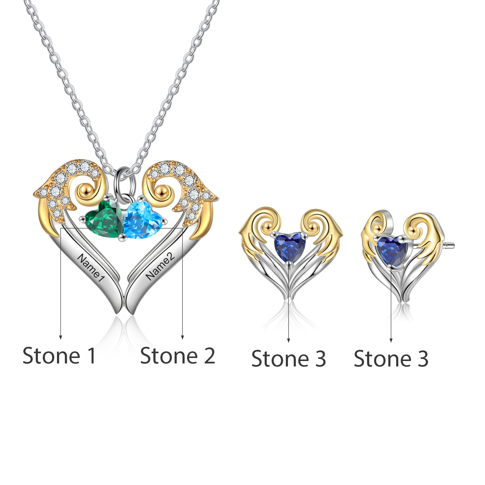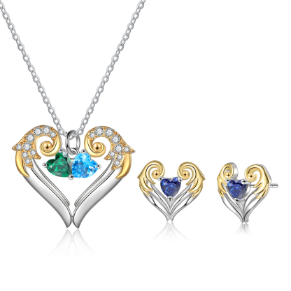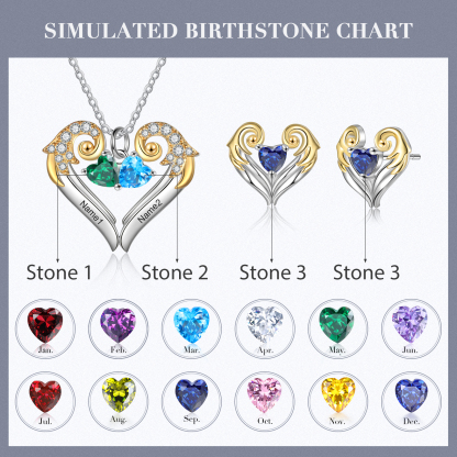 Personalized Heart Wings Necklace And Earring With Birthstones Custom 2 Names Gift For Her
