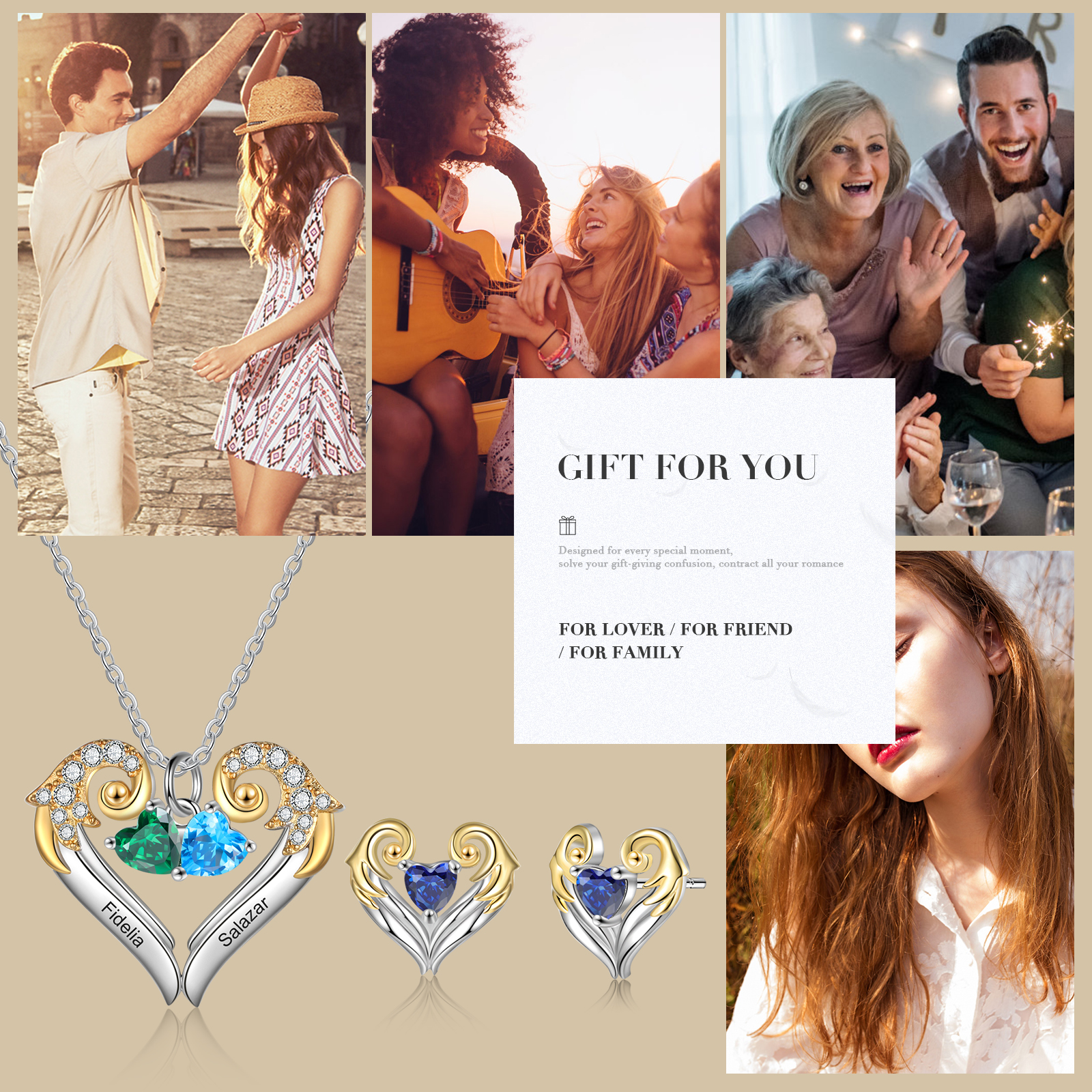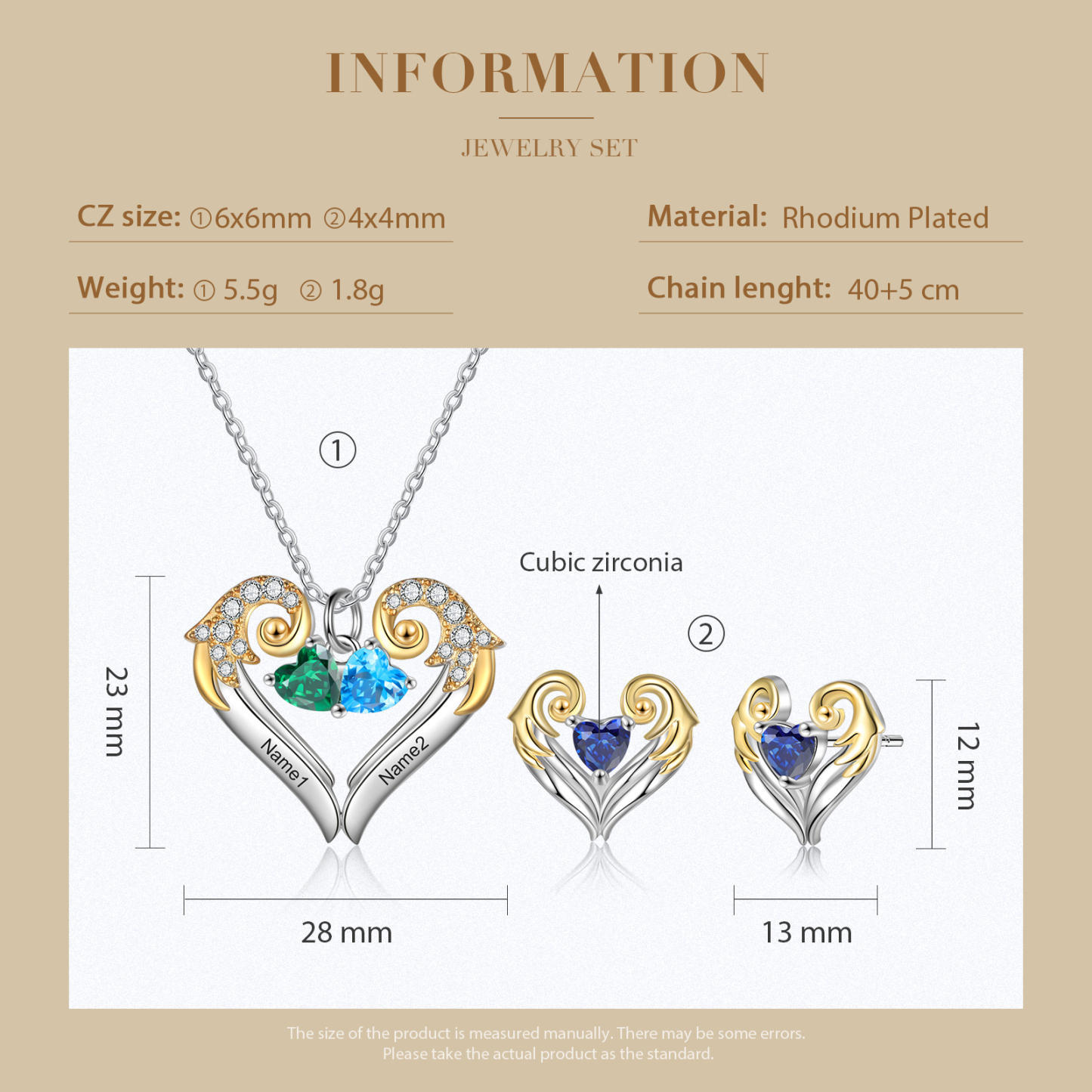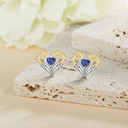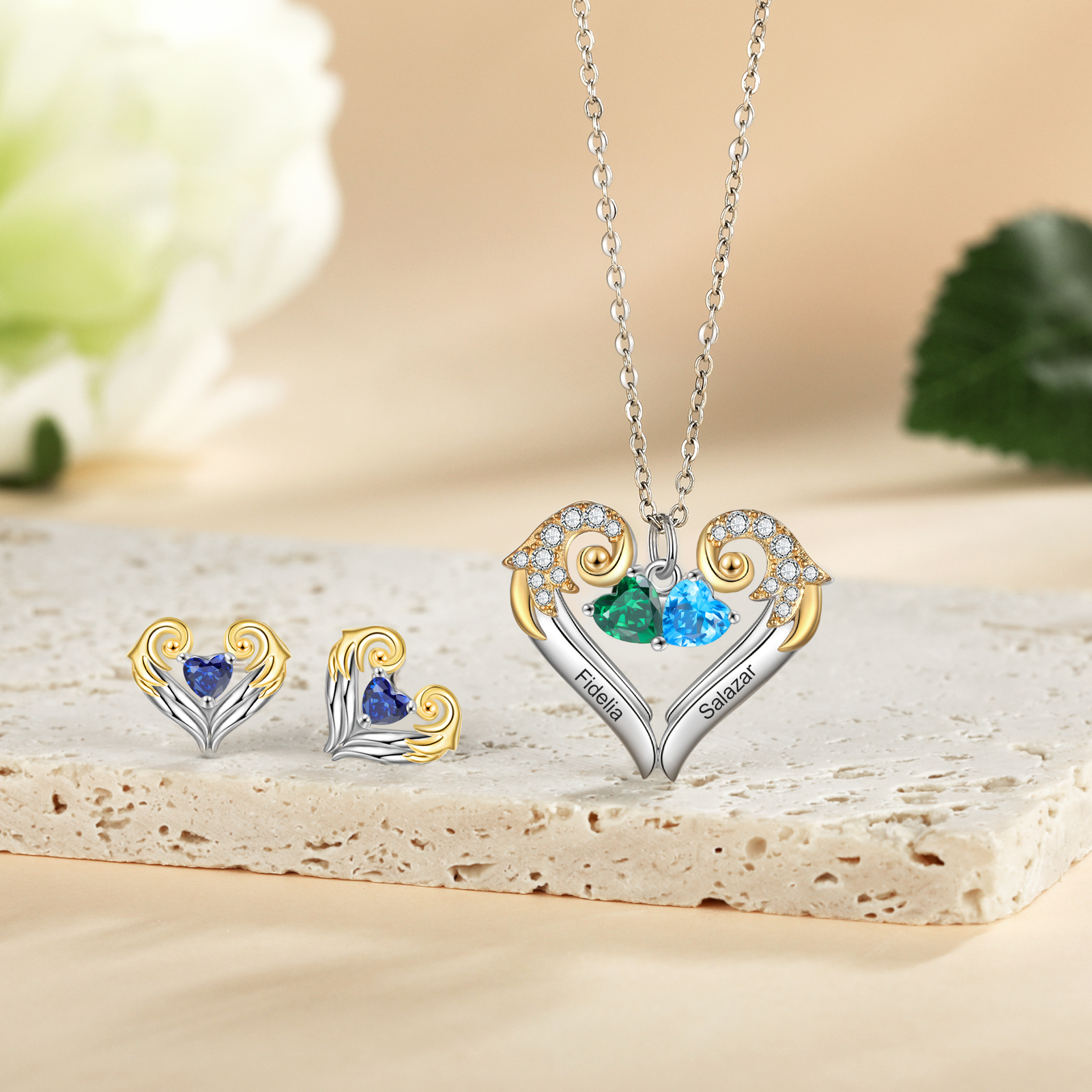 Personalized Heart Wings Necklace And Earring With Birthstones Custom 2 Names Gift For Her