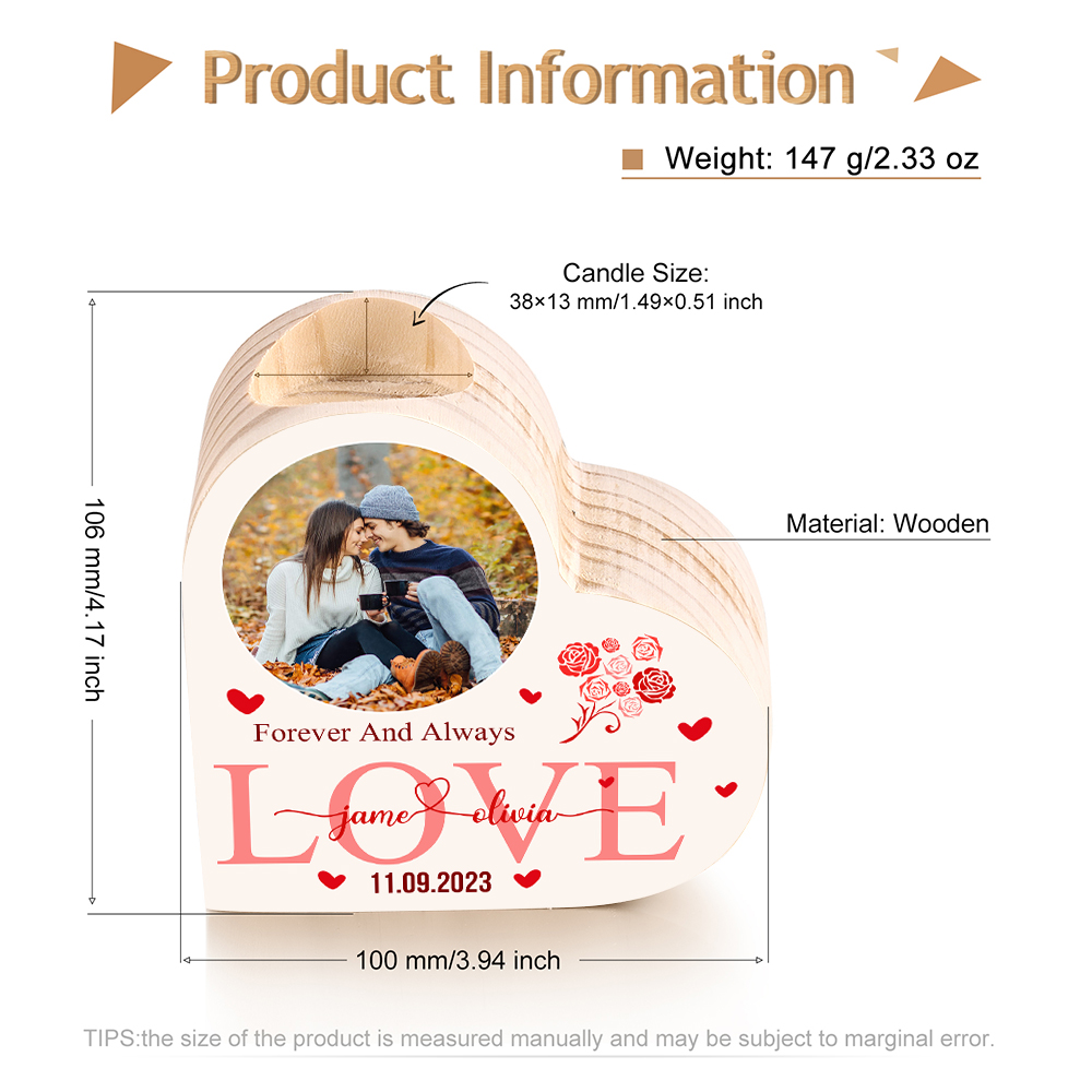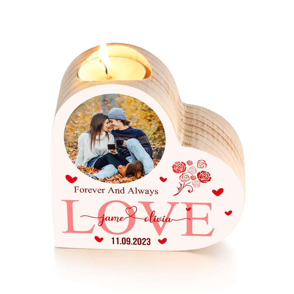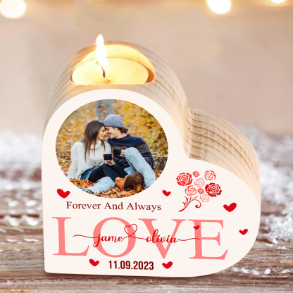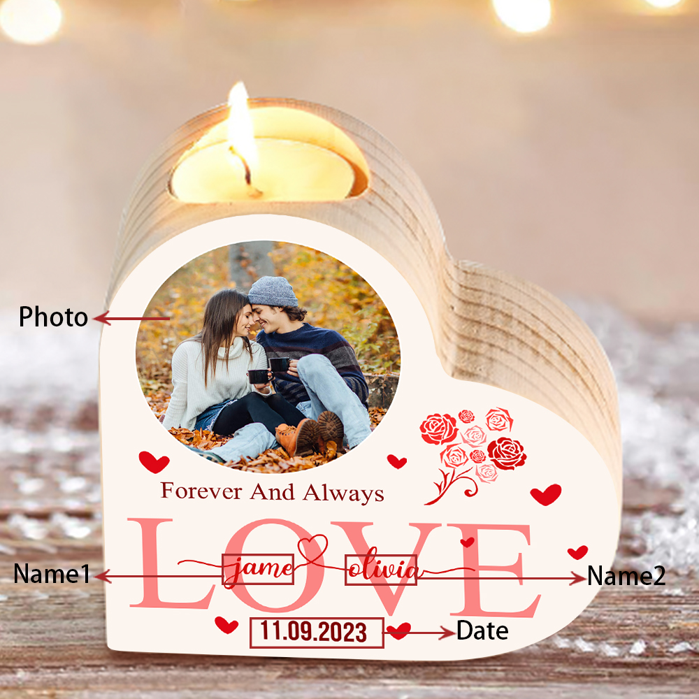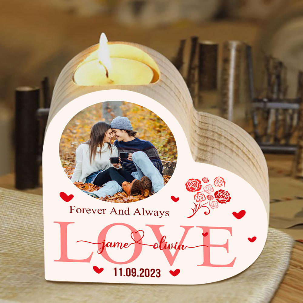 Personalized Love Couple Heart Candle Holder Engrave Photo-Forever And Always Love- Wooden Candlesticks Valentines Gift