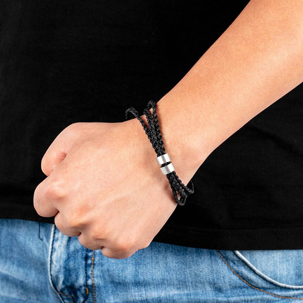 This personalized men bracelet features a handsomely braided band that fastens with a sturdy silver clasp. Couple's jewelry with the grilfriend names or any text you like. Custom made just for you by you personalize choice.