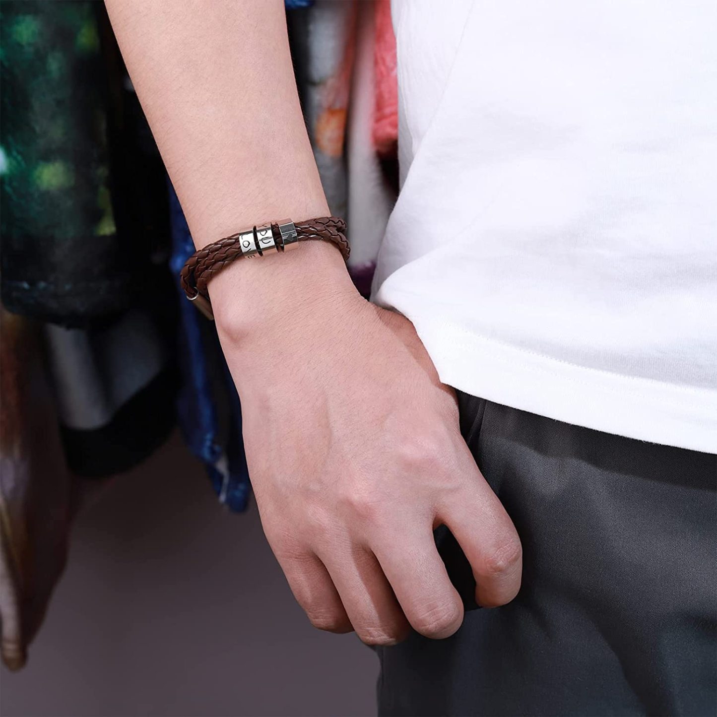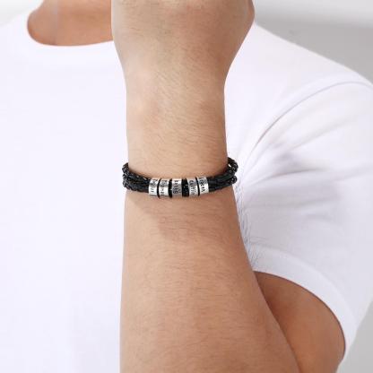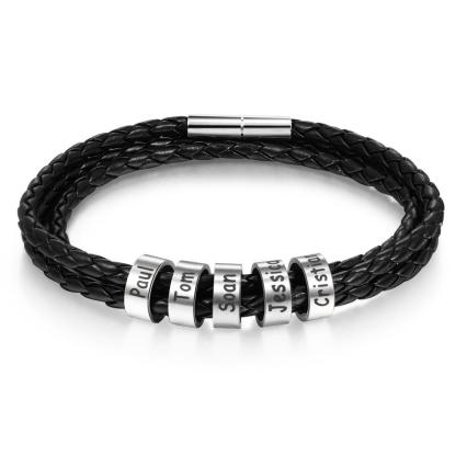 Personalized Mens Leather Braided Bracelet With 6 Custom Beads Engarved 6 Family Names