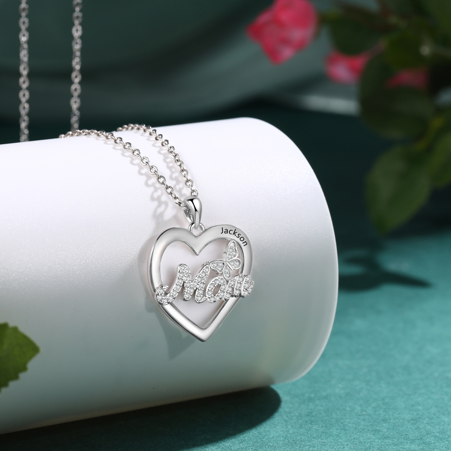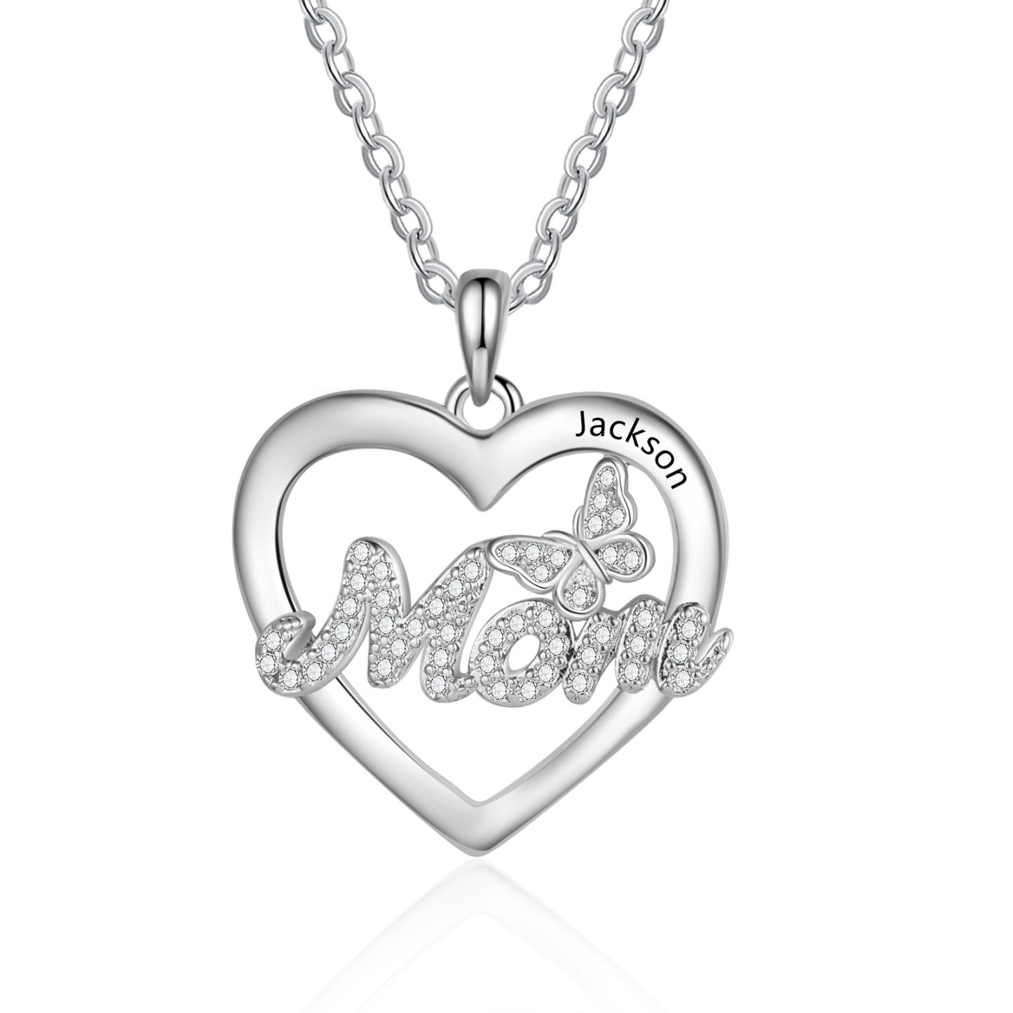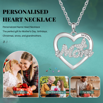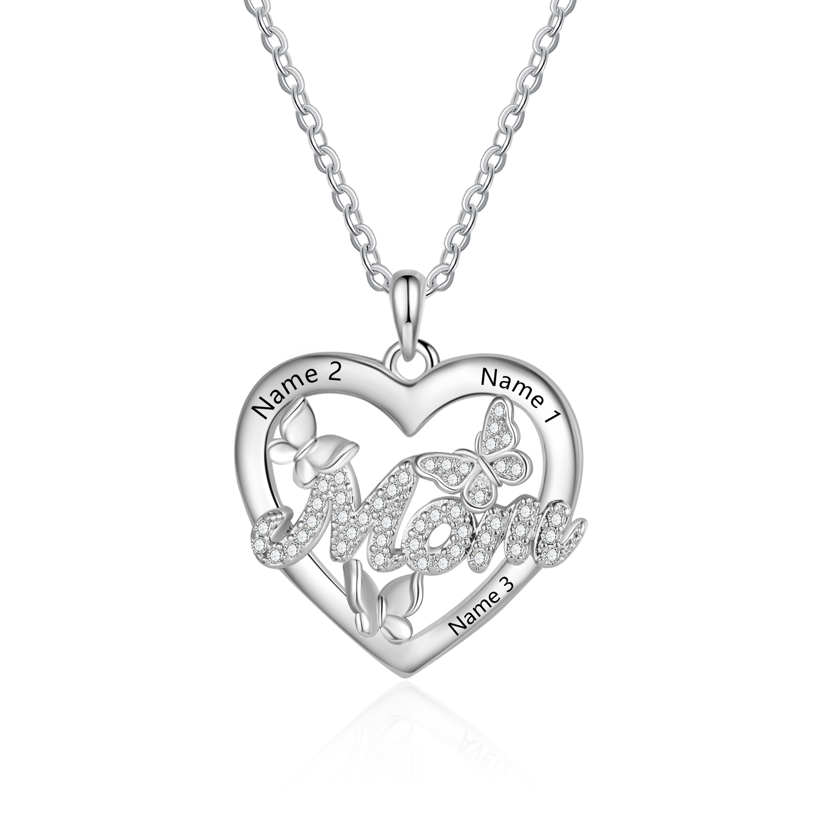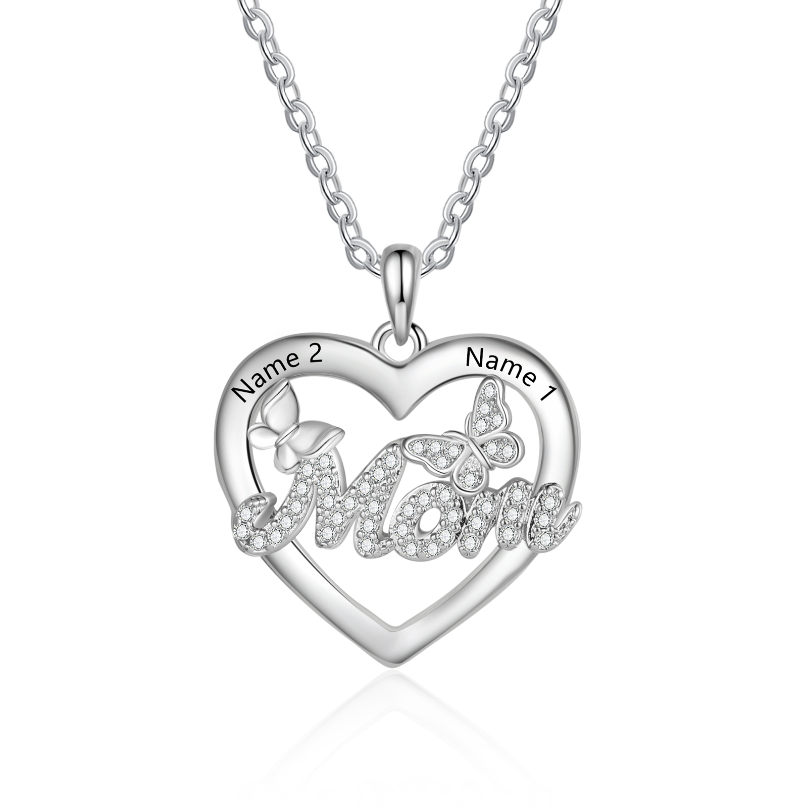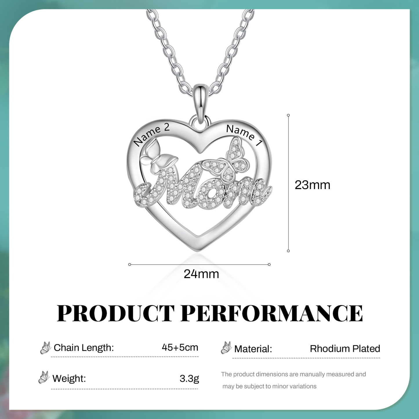 Keywords: personalized mom necklace, custom name necklace for mom, engraved heart pendant, gift for mom, grandma necklace, sentimental Mother’s Day gift, butterfly heart necklace, rhodium-plated jewelry, new mom gift, meaningful women’s gift