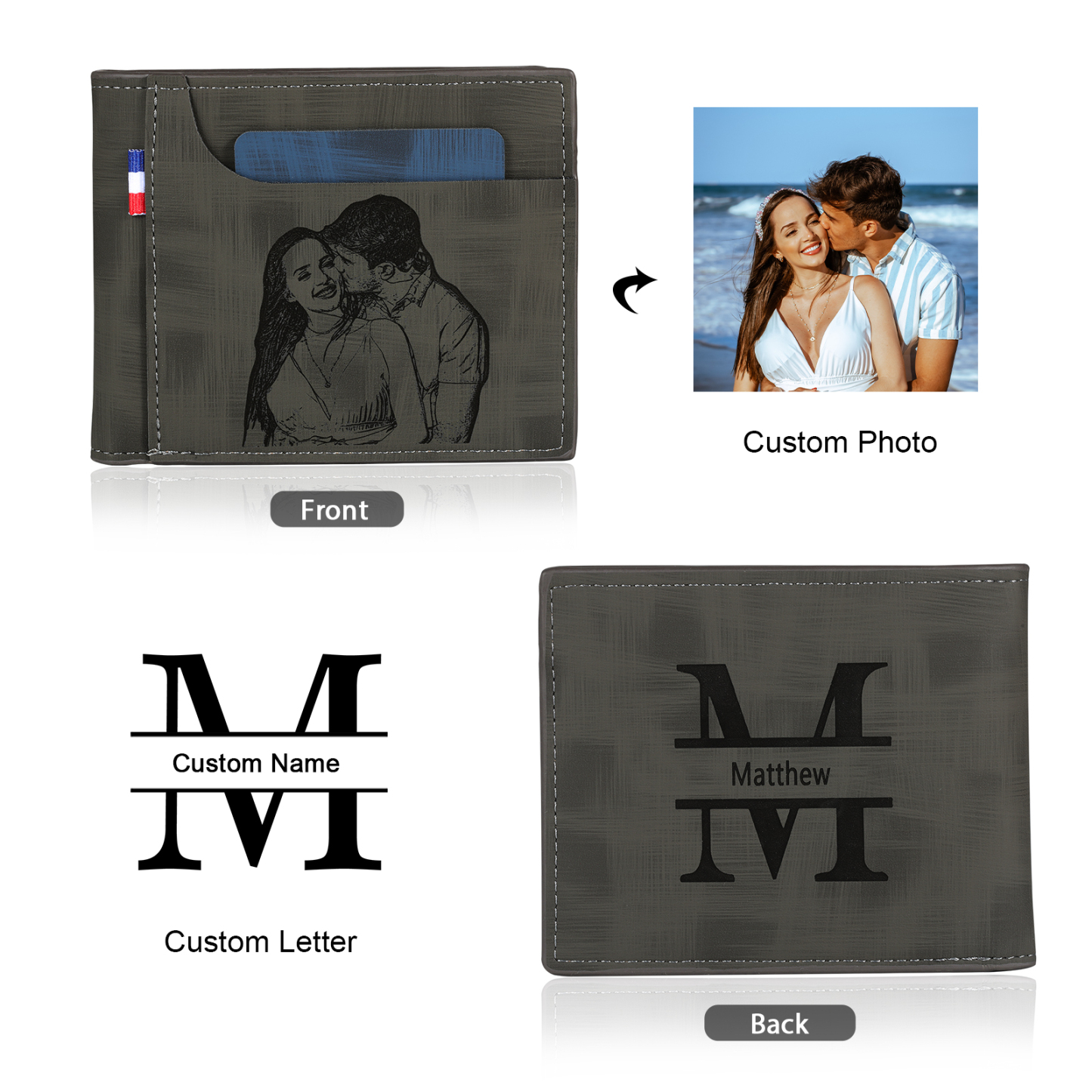1. Type the names and photo you want to be engraved on the wallet (please notice your spelling and formatting). In order to keep love in your wallet, our Wallet will capture a moment that is gone forever. The names will never fall off!