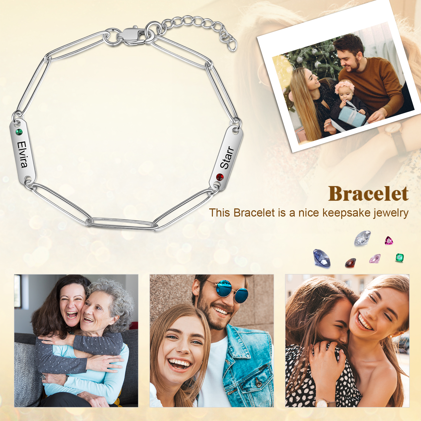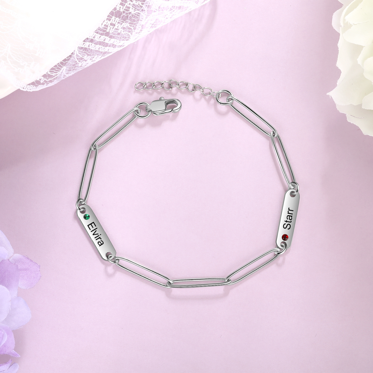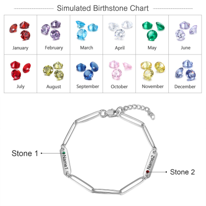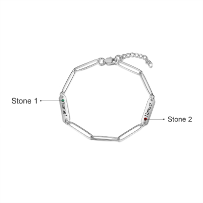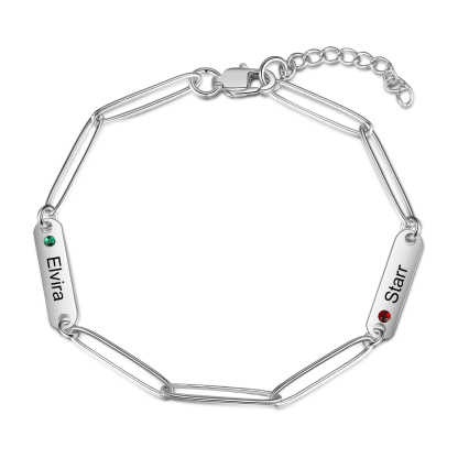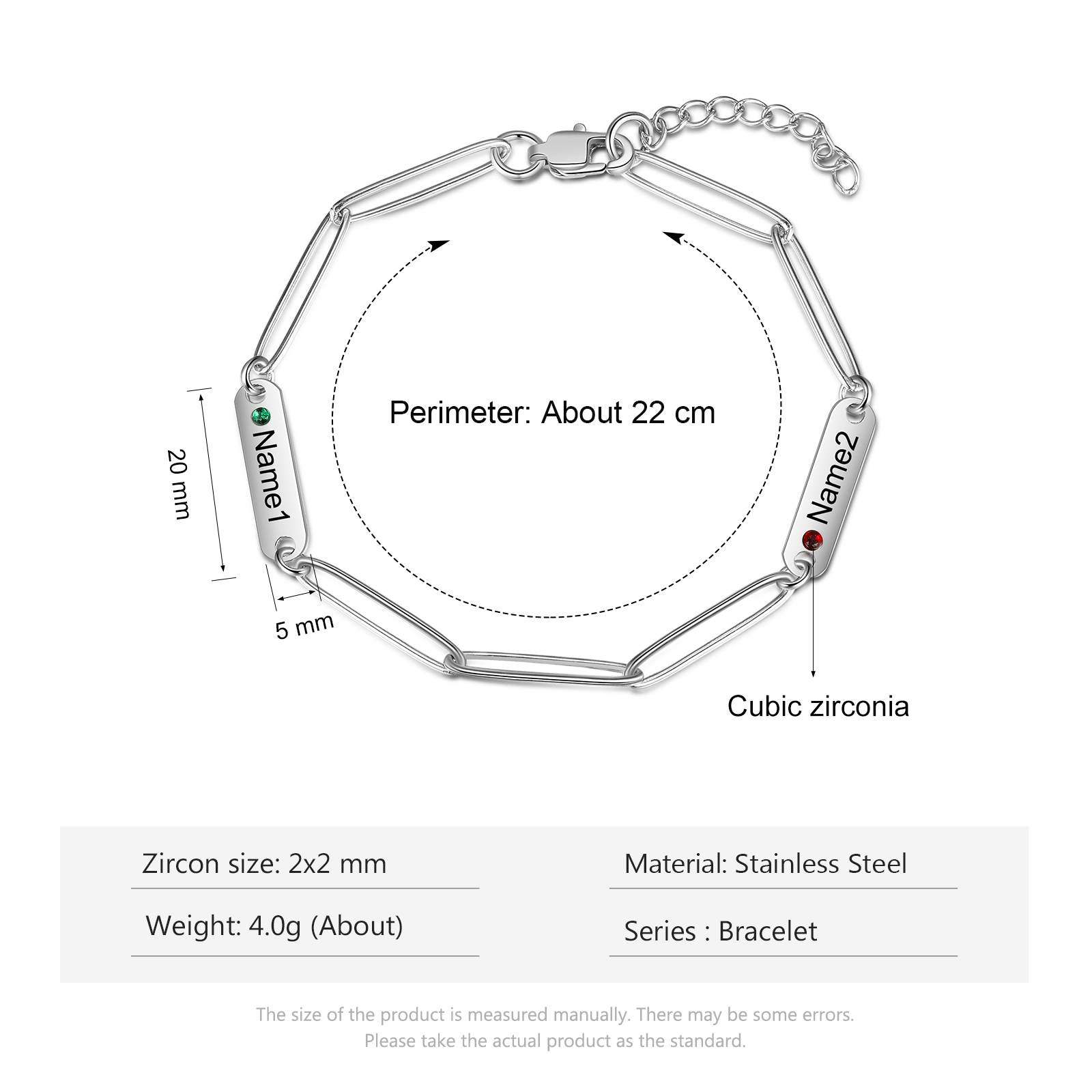 Personalized Paperclip Chain Bracelet With Birthstone Engraved 2 Names Necklace For Women