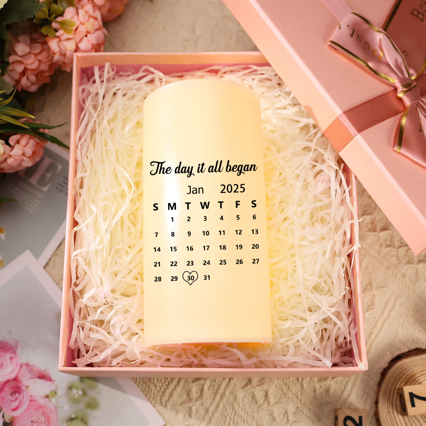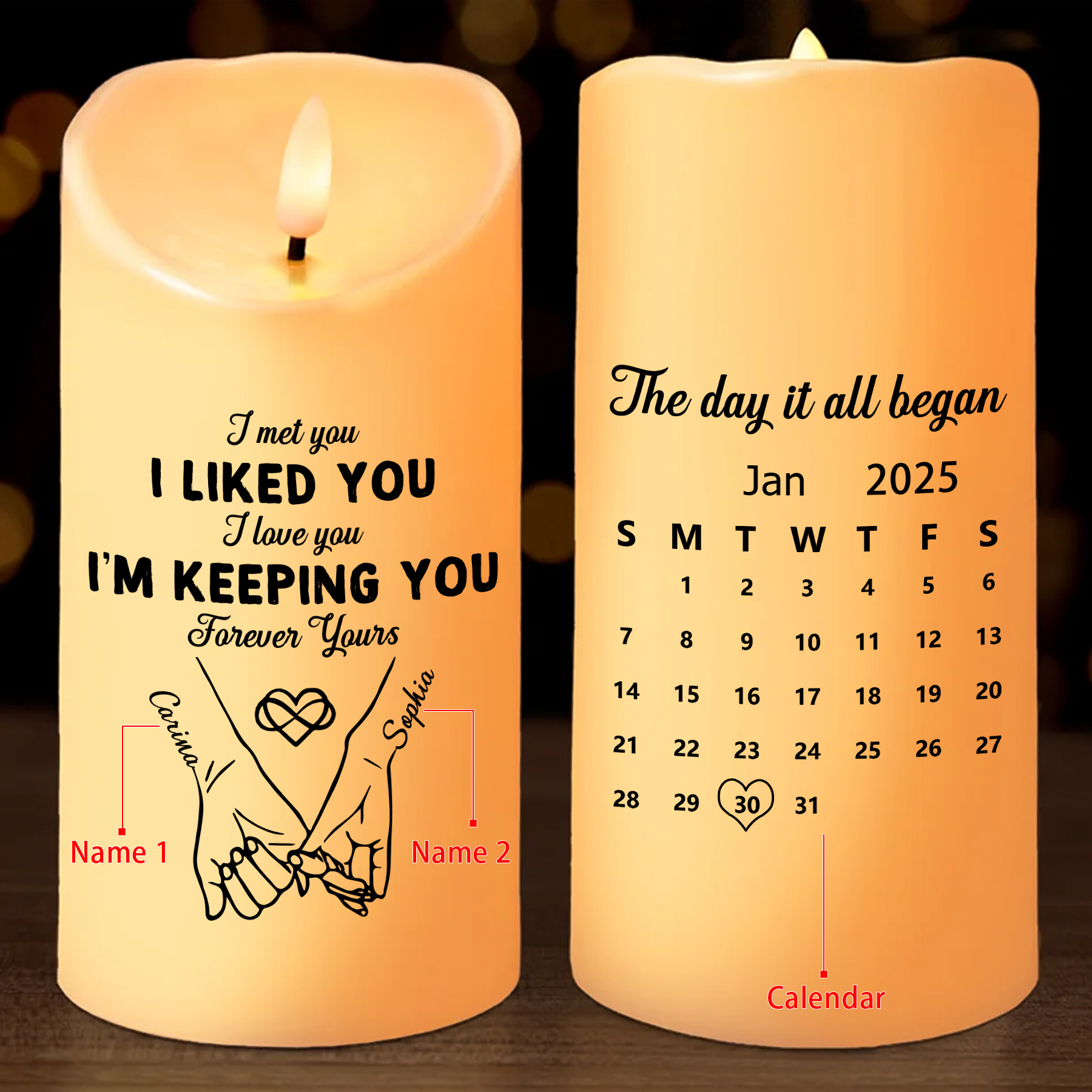 Keywords: personalized candle, custom date candle, couple gift, anniversary gift, romantic LED candle, flameless pillar candle, gift for girlfriend, gift for boyfriend, sentimental keepsake, custom name candle