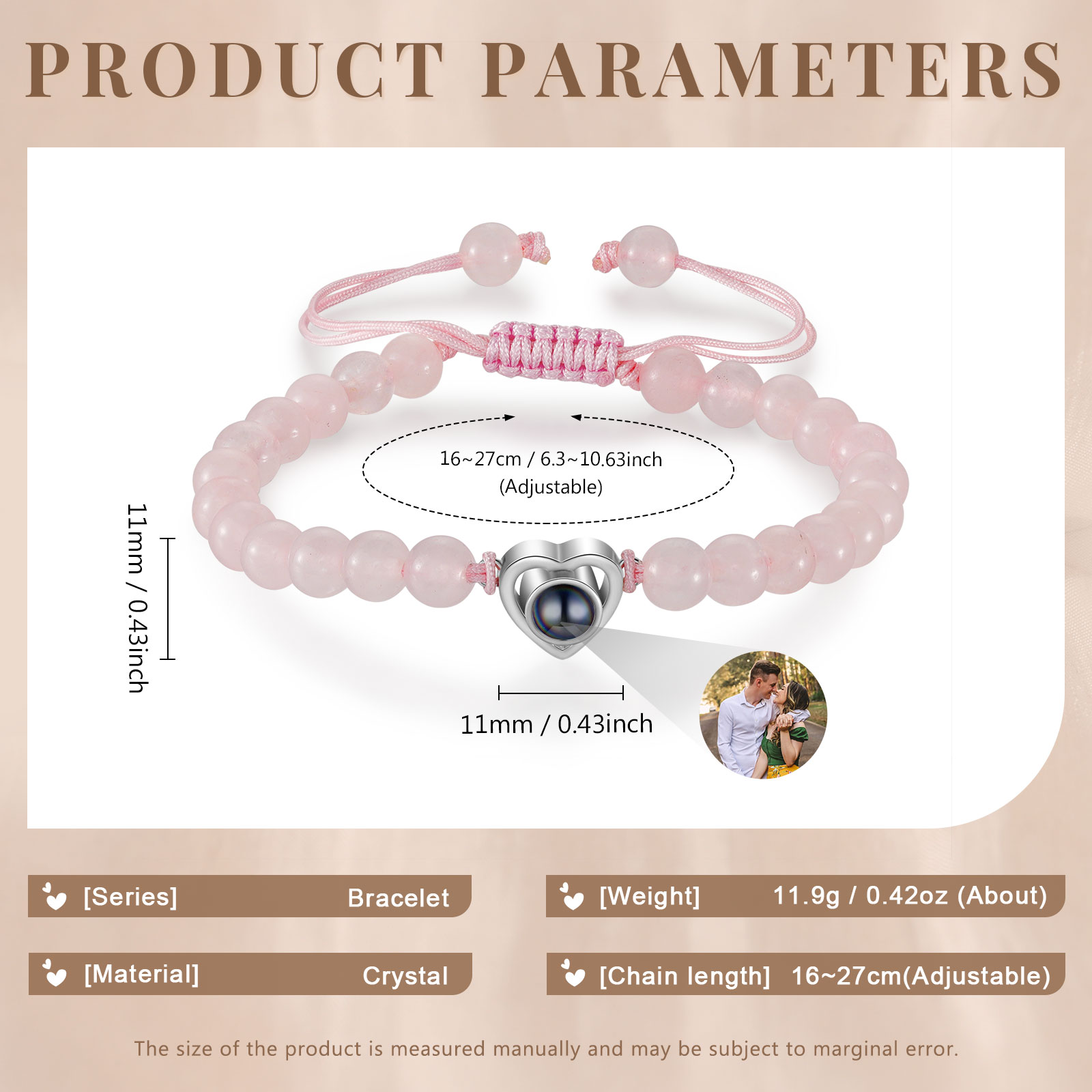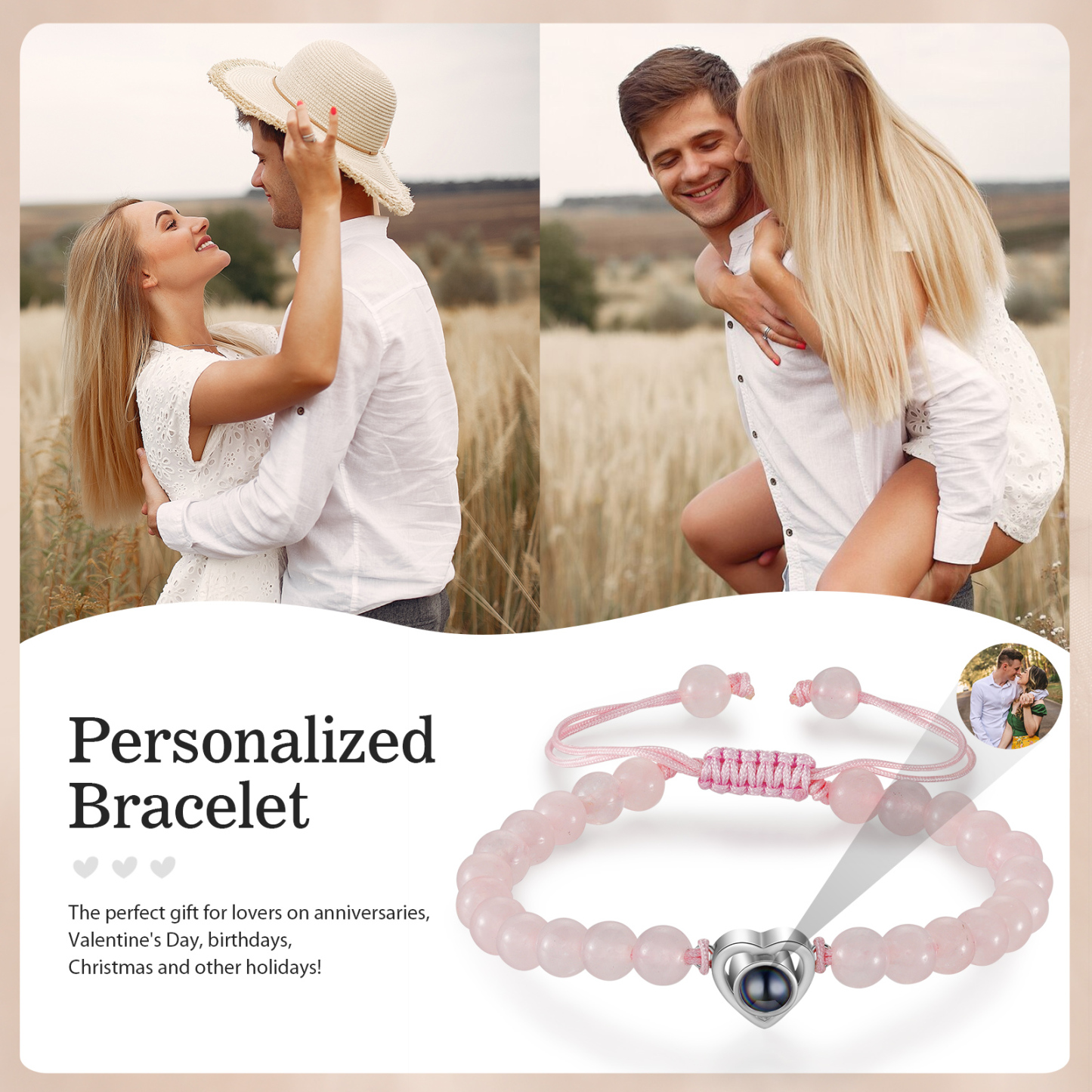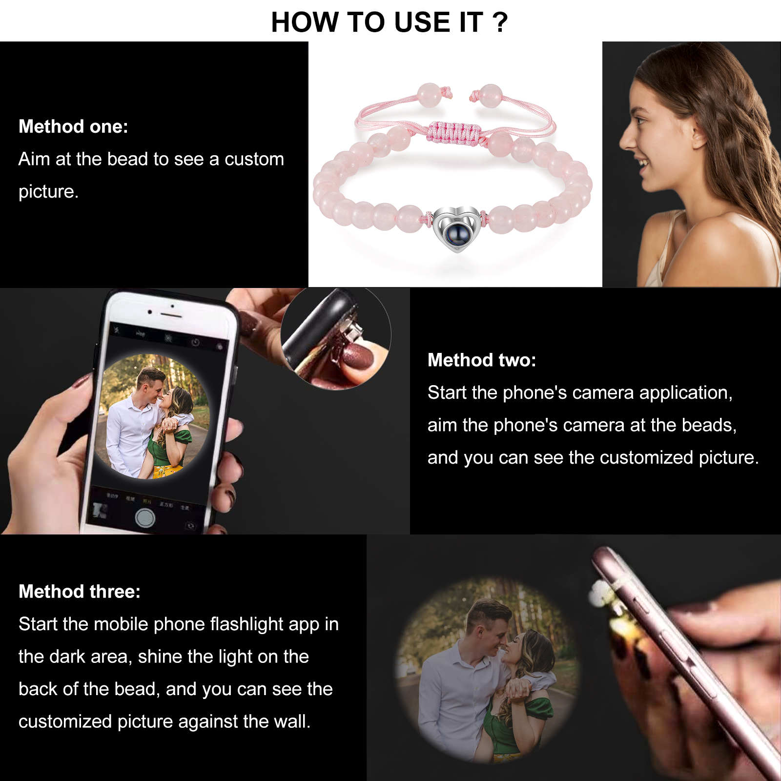 🌟 Use the mobile flashlight behind the crystal lens to project information and photos onto the wall or surface of your choice. You can add your and your partner's photo to make these bracelets a unique and meaningful gift, emphasizing your special connection.