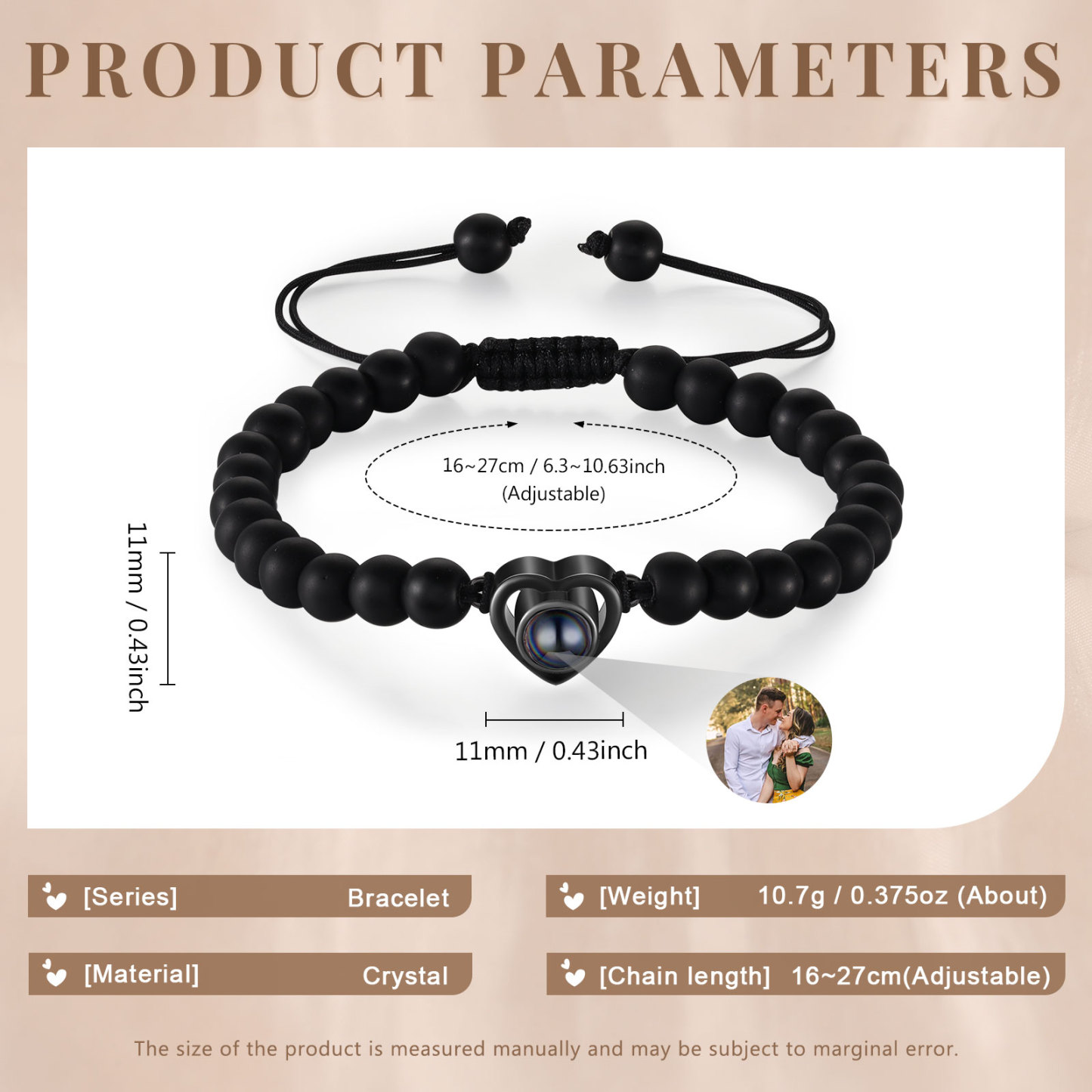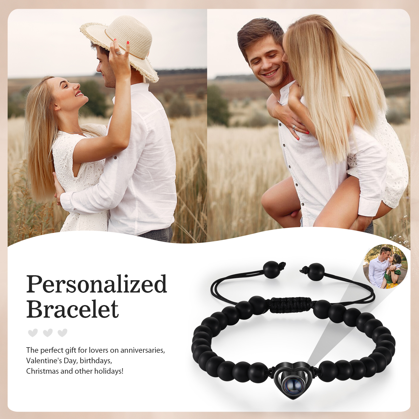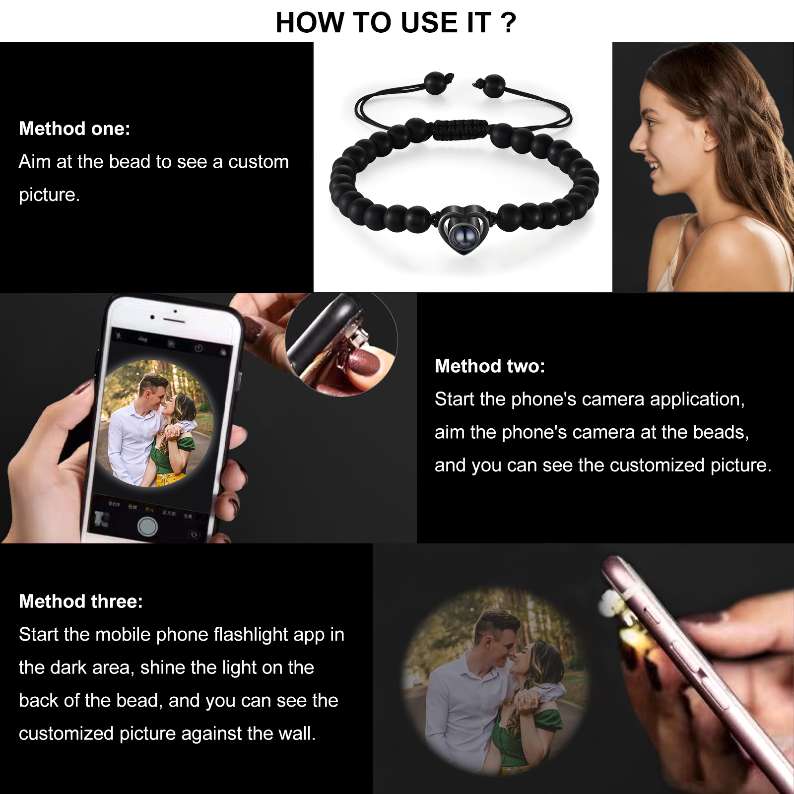 🌟 Use the mobile flashlight behind the crystal lens to project information and photos onto the wall or surface of your choice. You can add your and your partner's photo to make these bracelets a unique and meaningful gift, emphasizing your special connection.