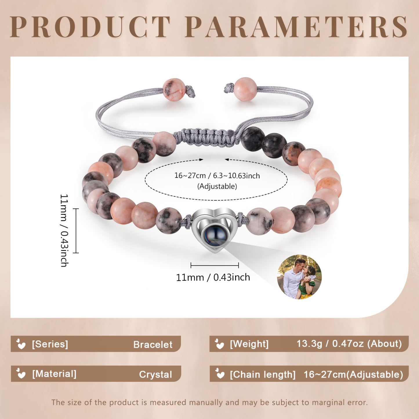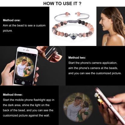 🌟 Use the mobile flashlight behind the crystal lens to project information and photos onto the wall or surface of your choice. You can add your and your partner's photo to make these bracelets a unique and meaningful gift, emphasizing your special connection.