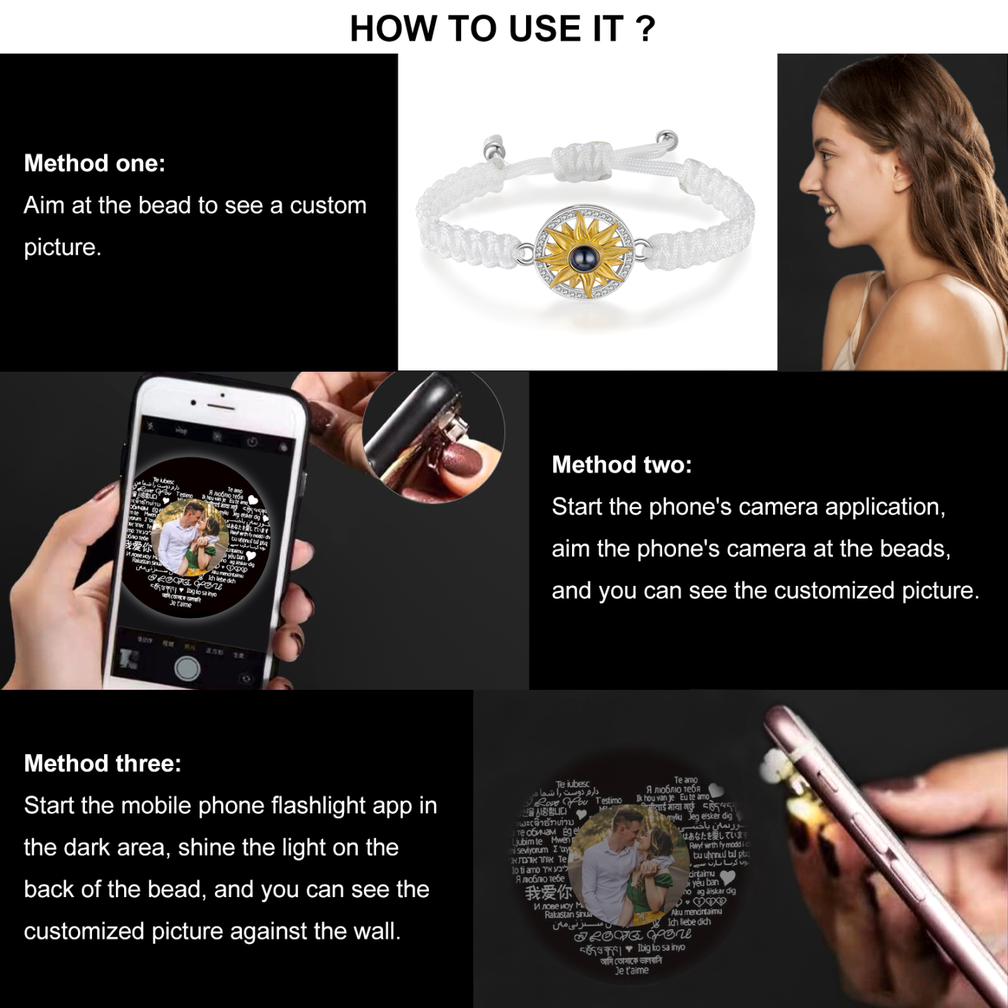 🌟 Use the mobile flashlight behind the crystal lens to project information and photos onto the wall or surface of your choice. You can add your and your partner's photo to make these bracelets a unique and meaningful gift, emphasizing your special connection.