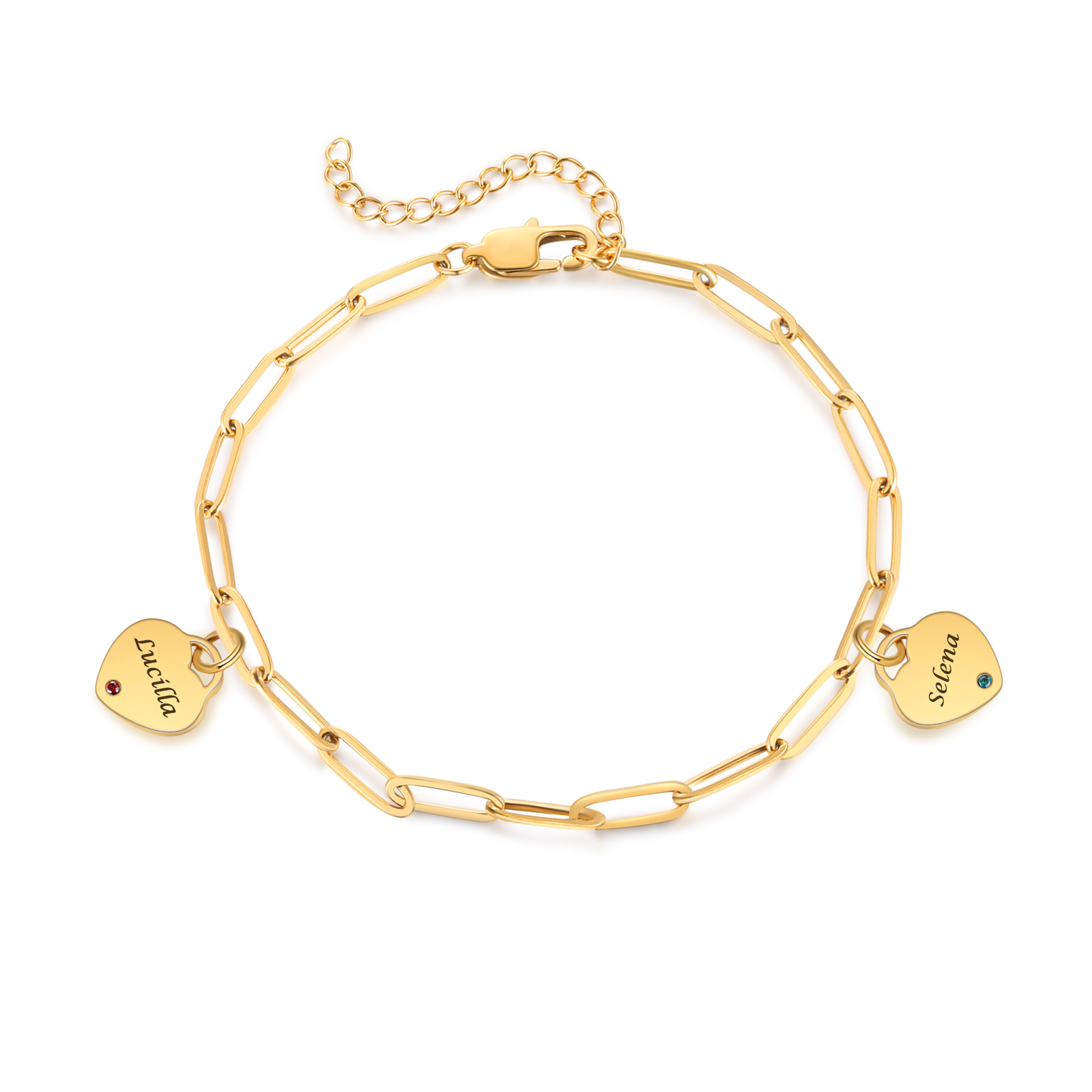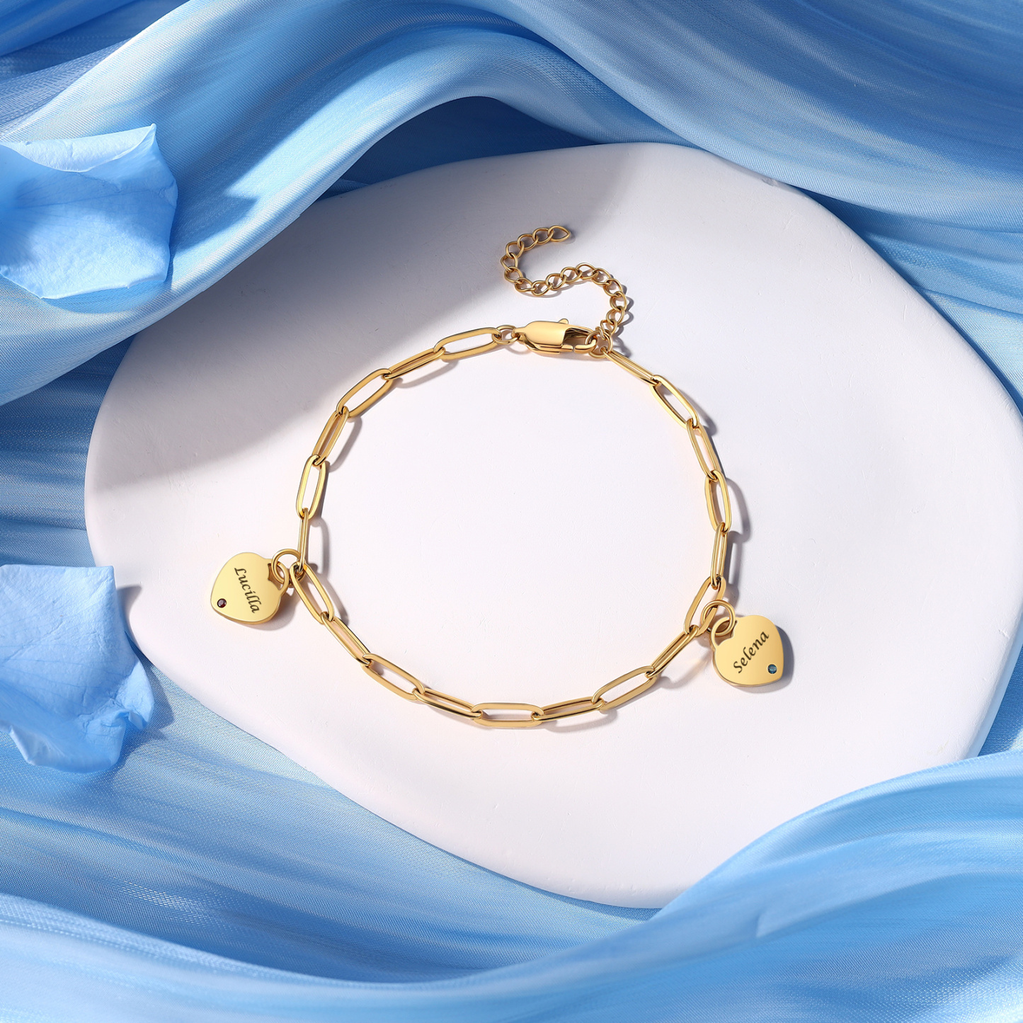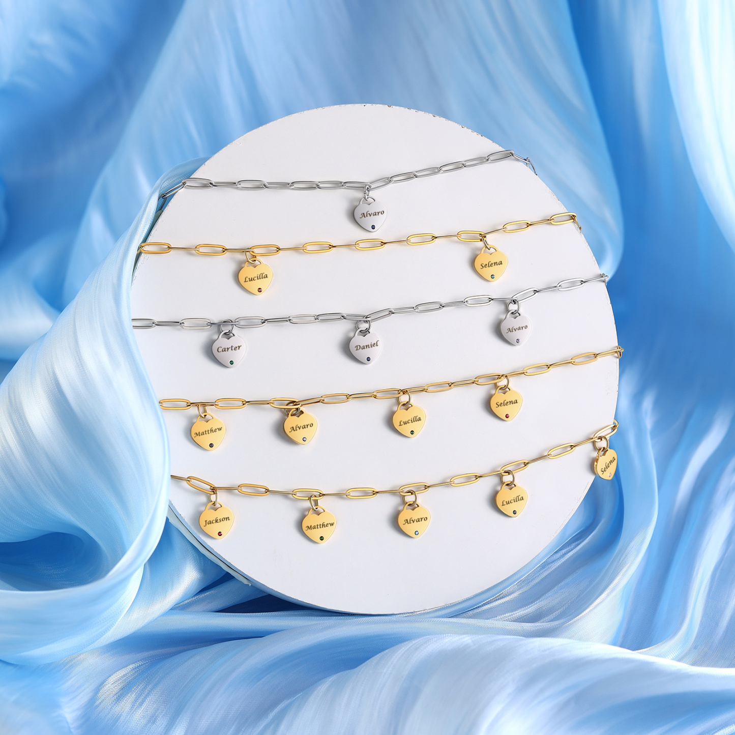 - Paperclip-link anklet, customized with 1–5 name charms and matching birthstones