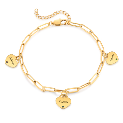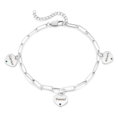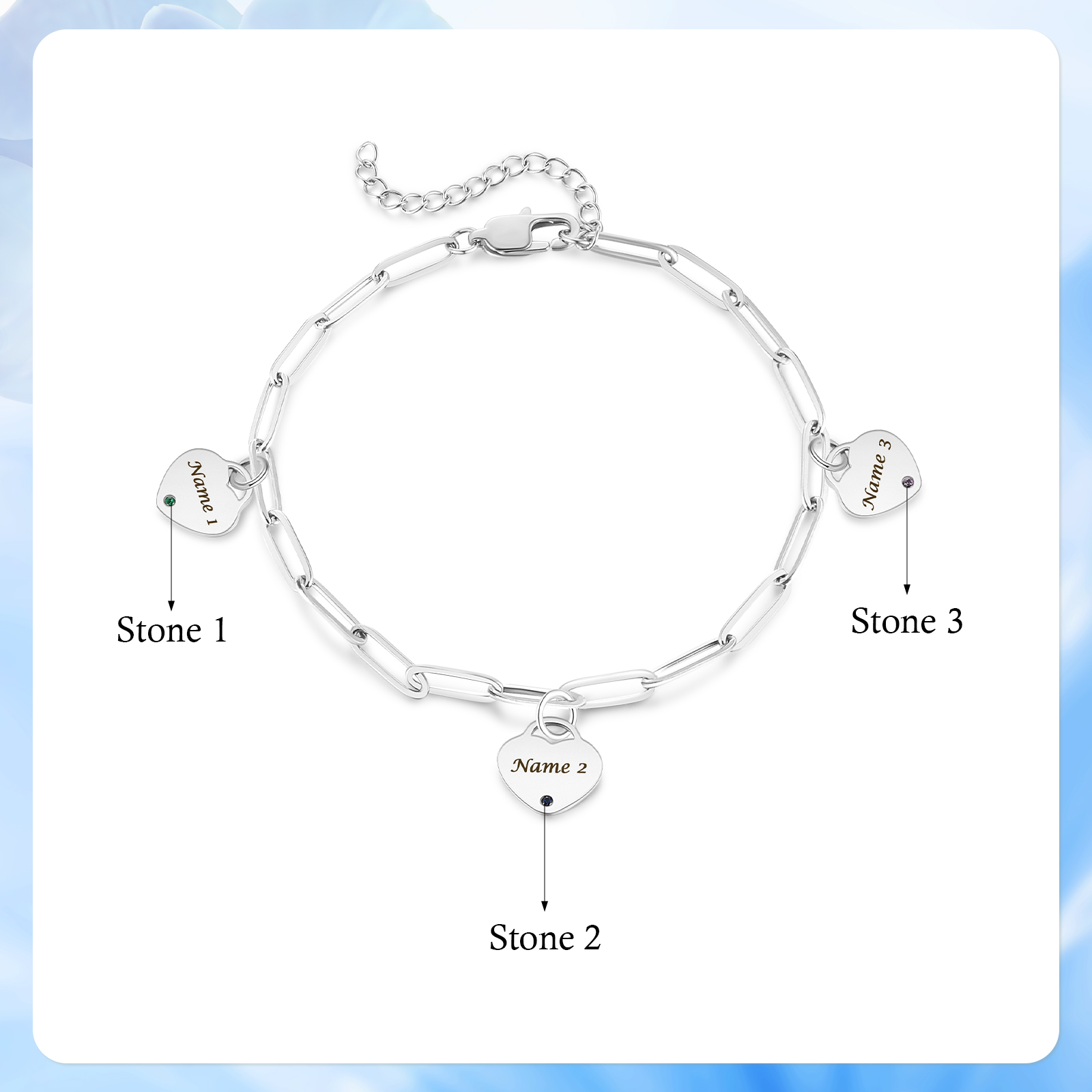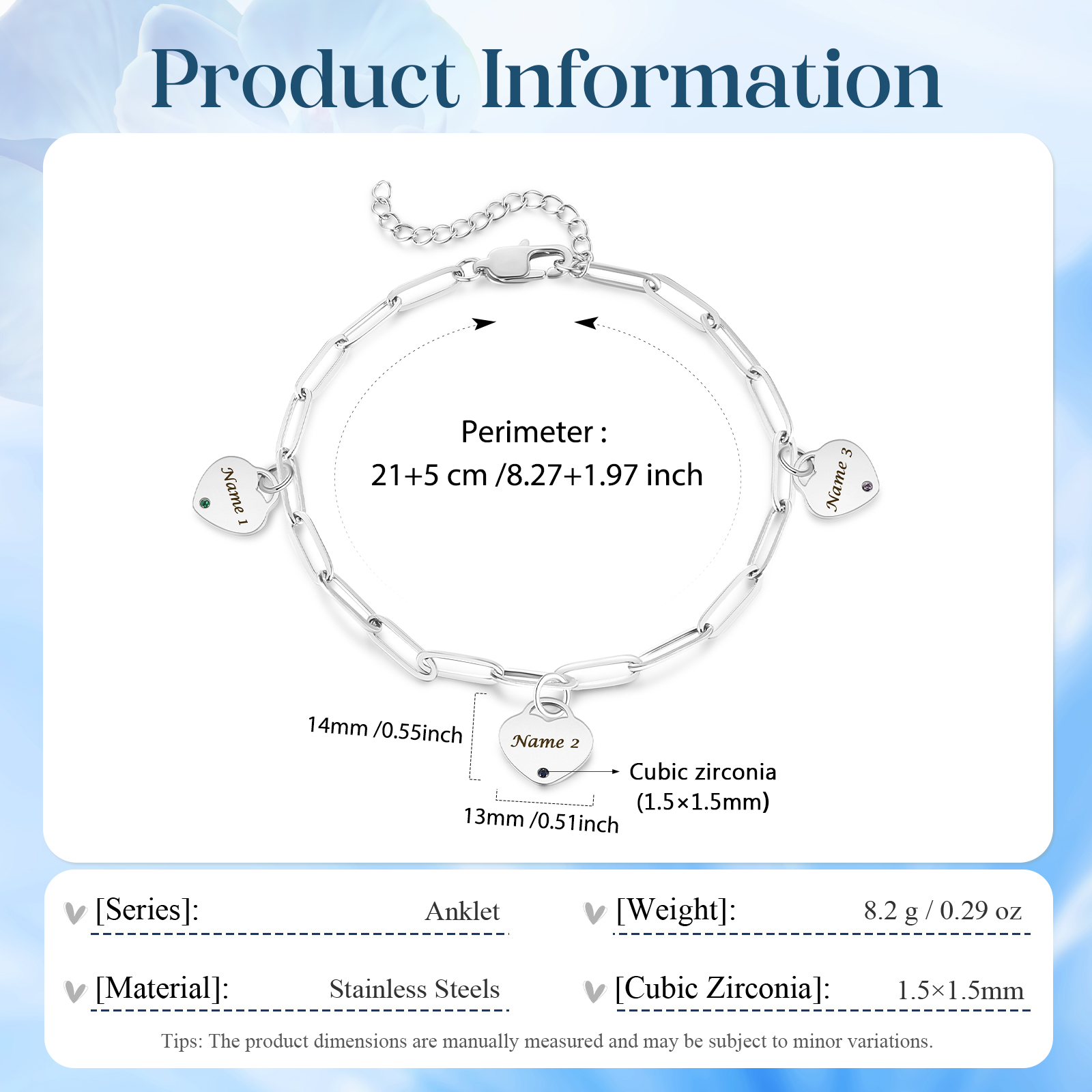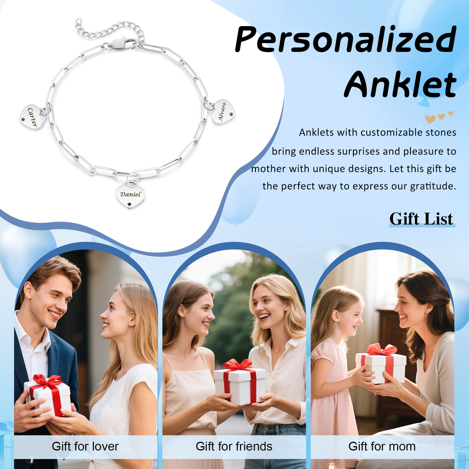 Give a heartwarming and practical gift with this personalized anklet, thoughtfully designed for moms, daughters, sisters, friends, or any special woman in your life. Customizable with 1–6 engraved heart charms and sparkling birthstones, this elegant ankle bracelet is both a stylish everyday accessory and a cherished keepsake.