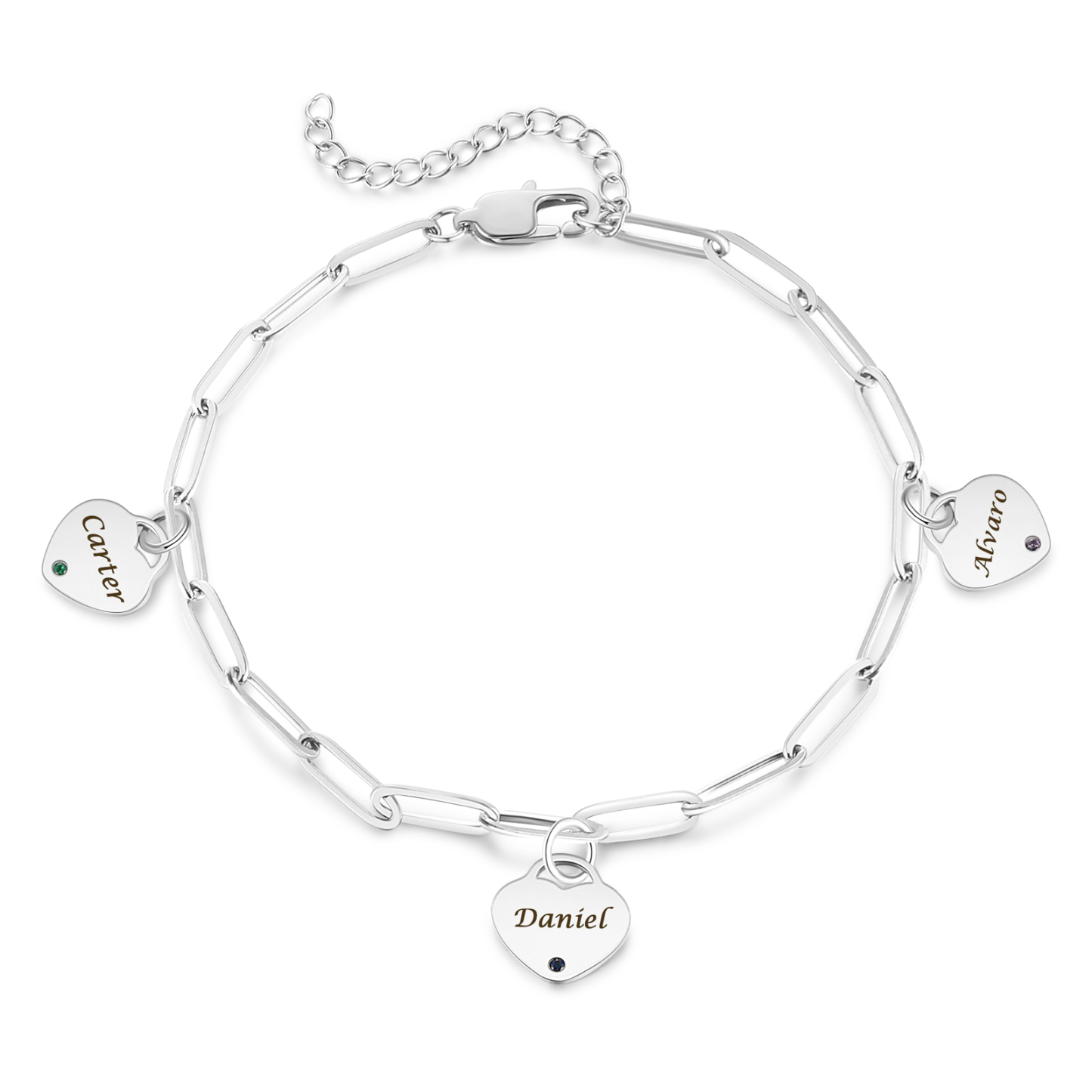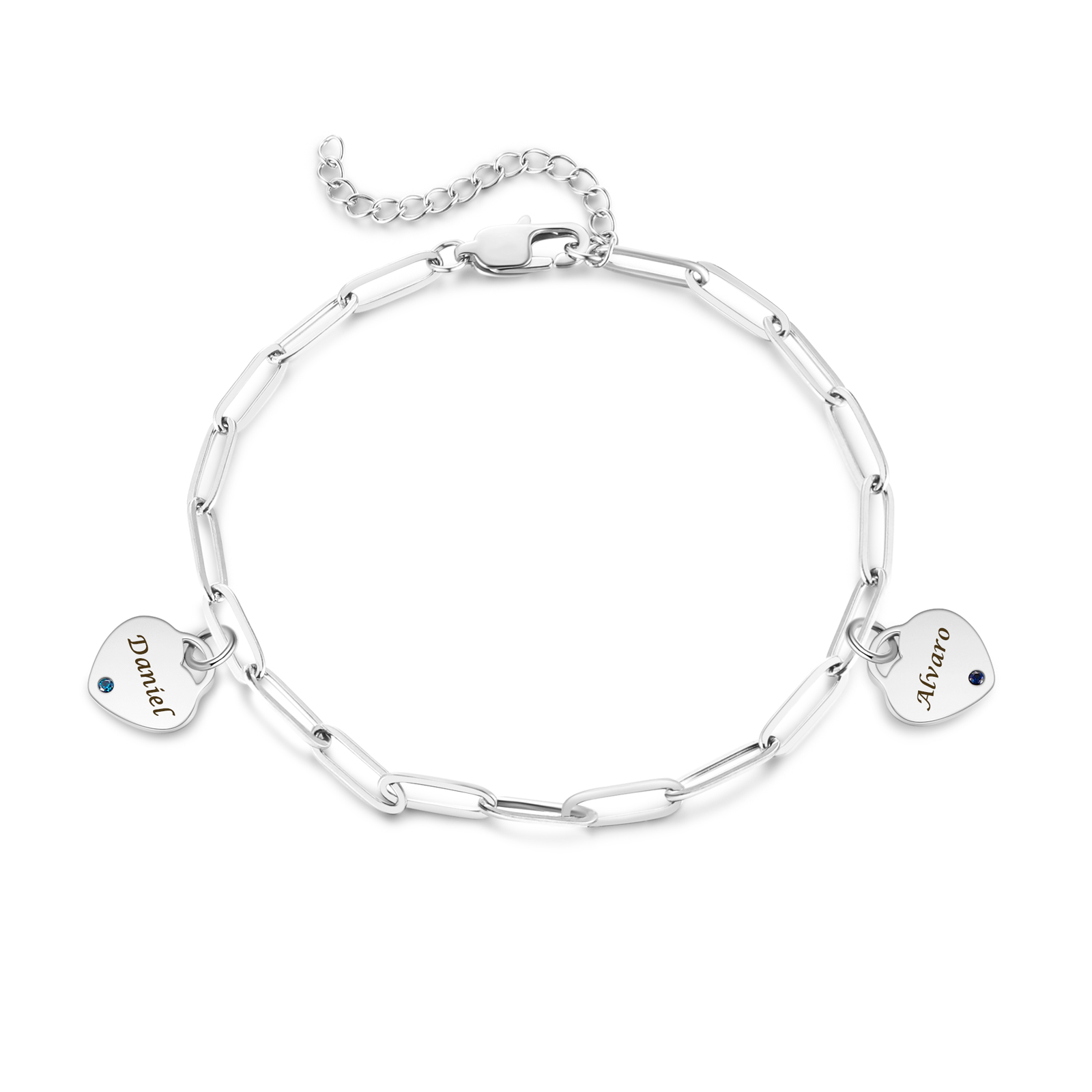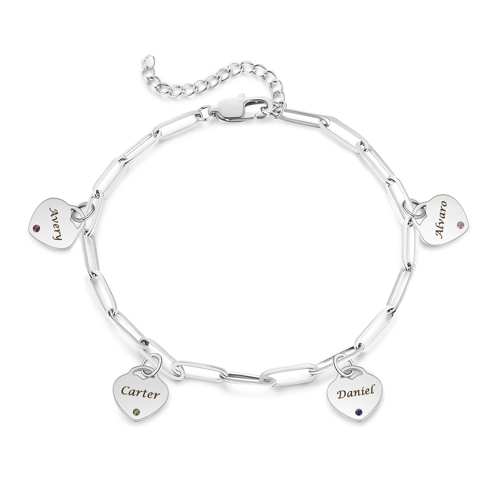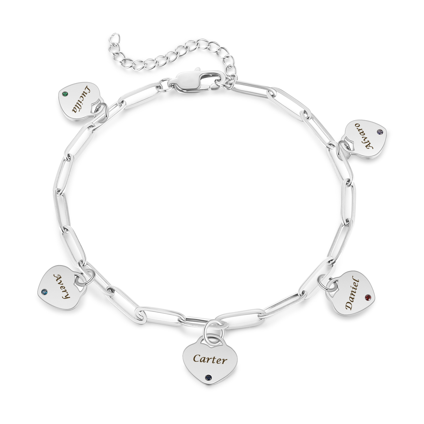 - Heart charms engraved with names; each set with a dainty cubic zirconia birthstone