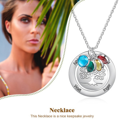 Personalized Family Tree Necklace with 4 Birthstones Engraved Names Gift For Women