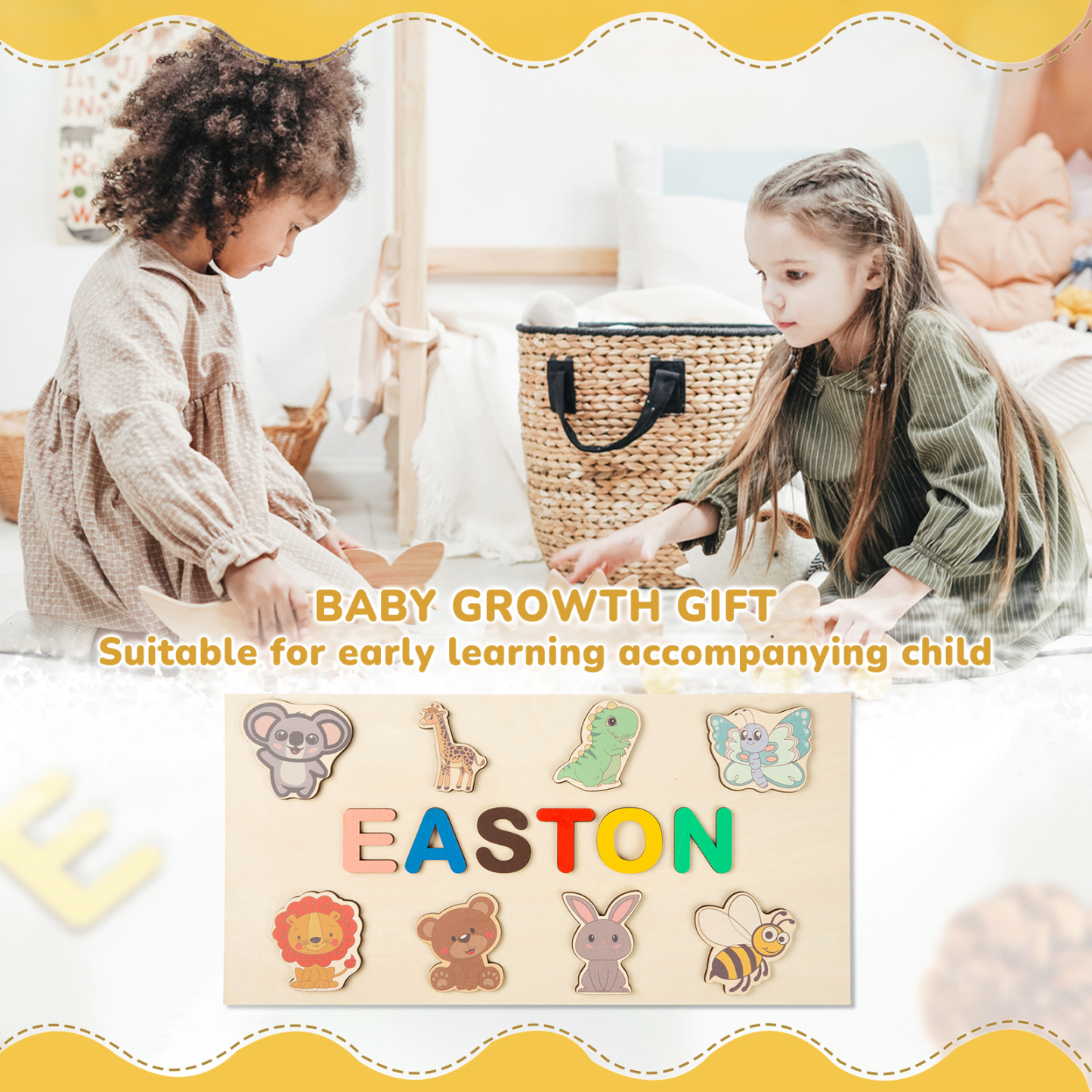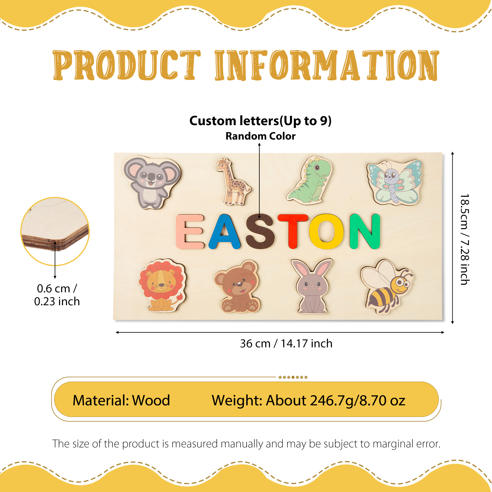 Personalized Wooden Name Puzzle, Custom Animals Wood Puzzle with Kids Name-Wooden Pegged Puzzles Educational Toy Gift for Toddlers/ Preschool Children Alphabet Early Learning
