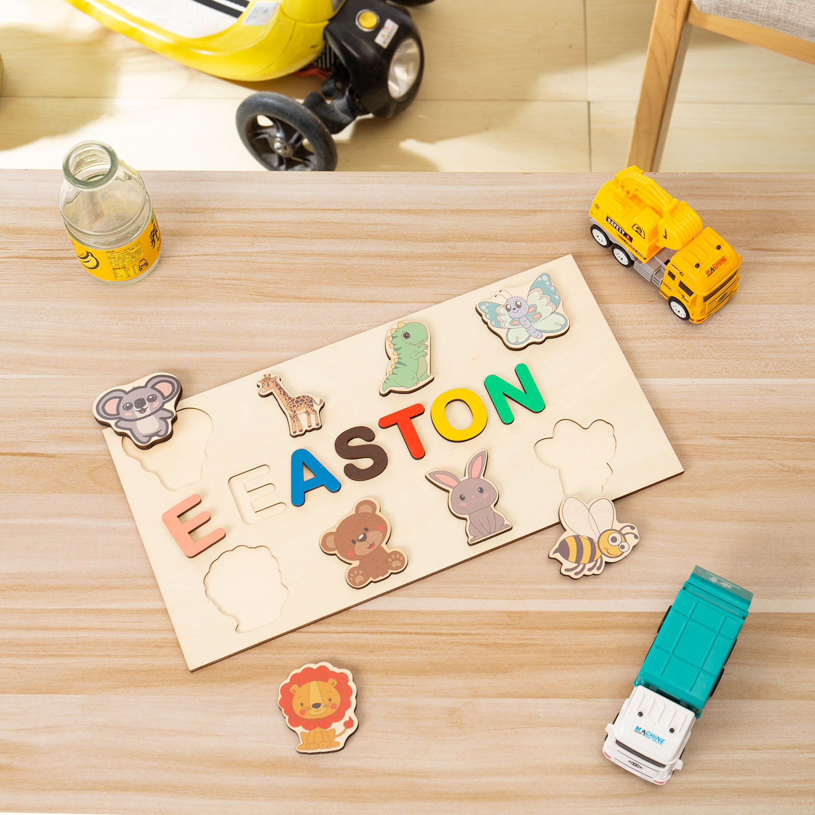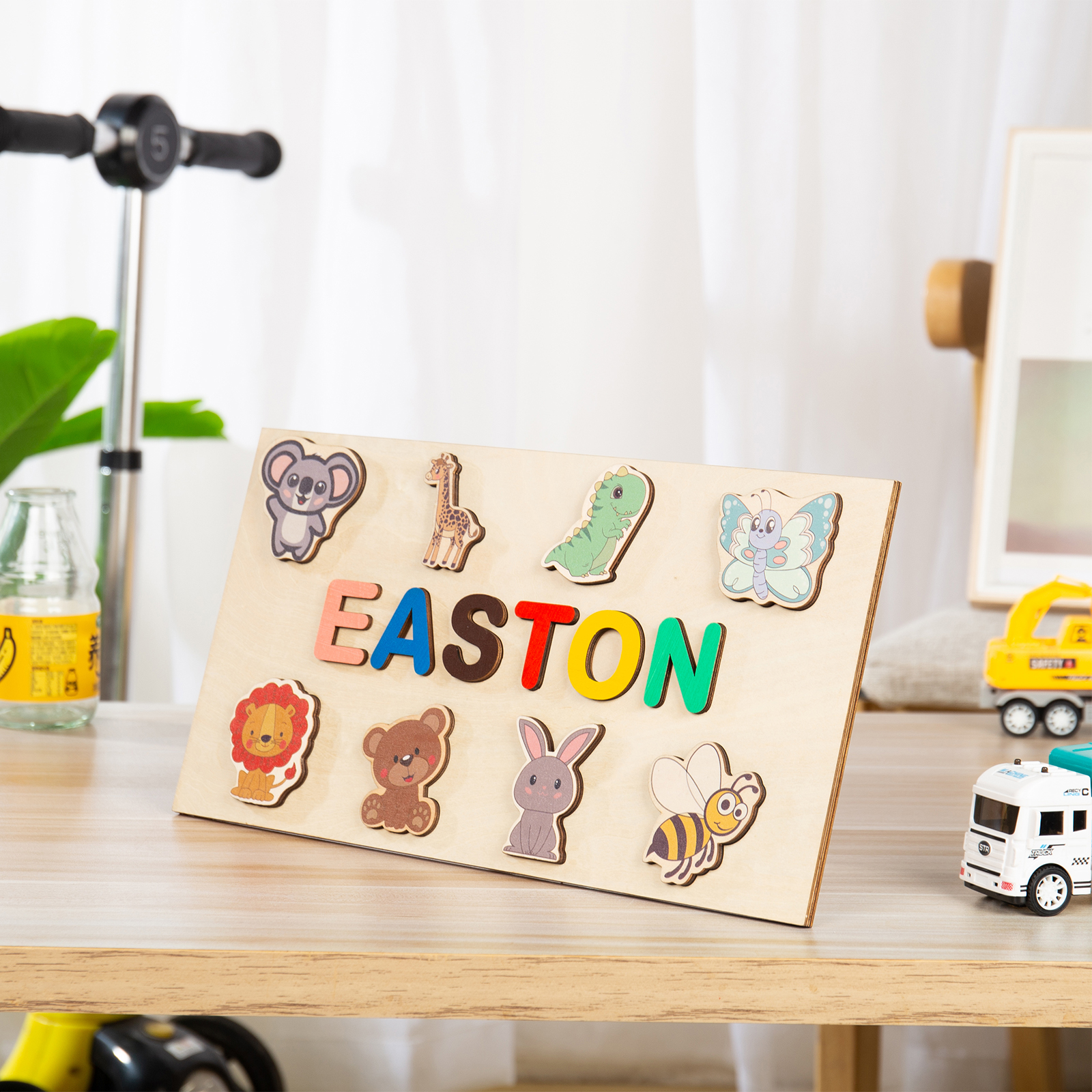 Learning while playing is the best way to start teaching your kid. The wooden name puzzle is a simple and nice toy that helps your child to develop motor skills, color & shape recognition. Learning how to spell his name is a great way to make kids feel special and loved as well.