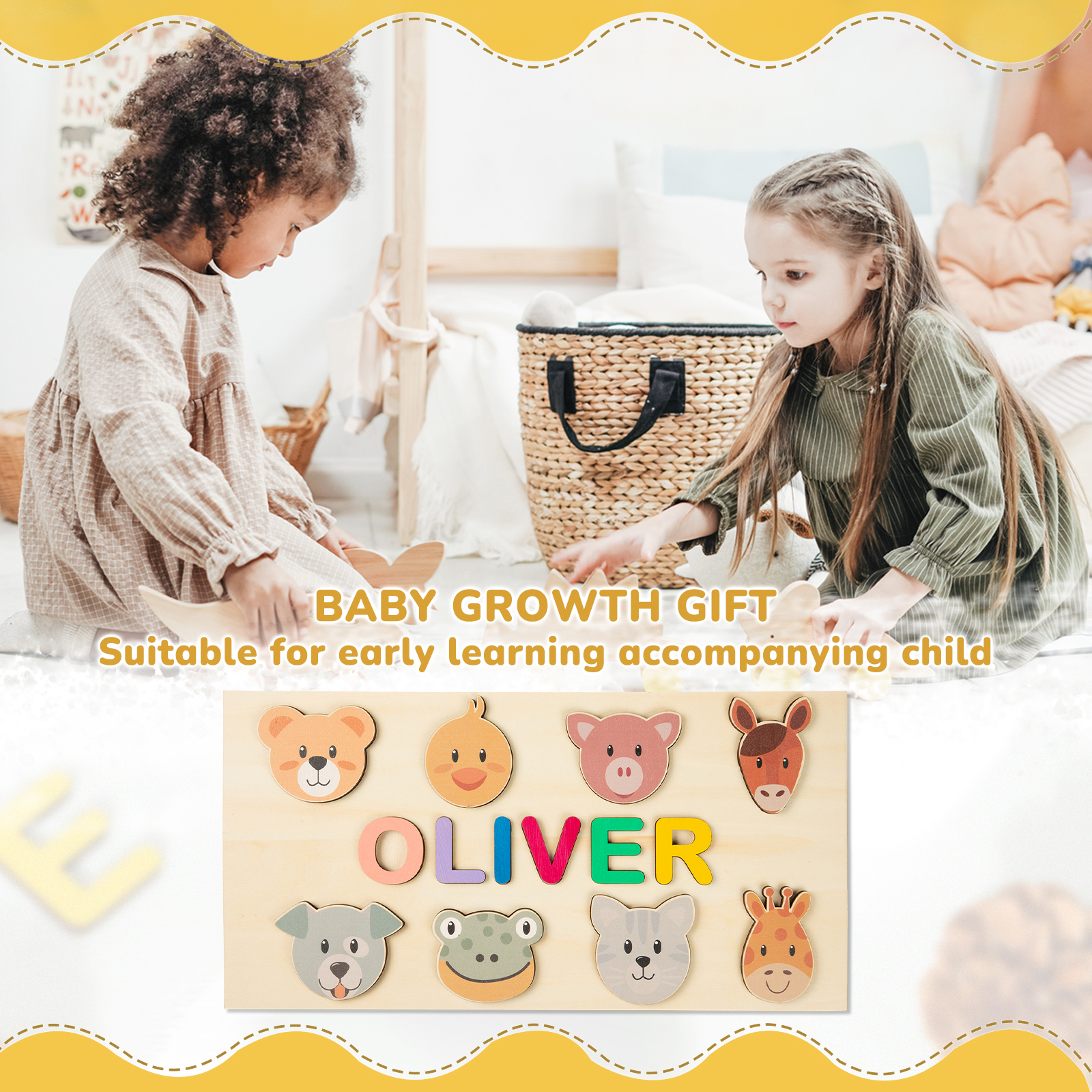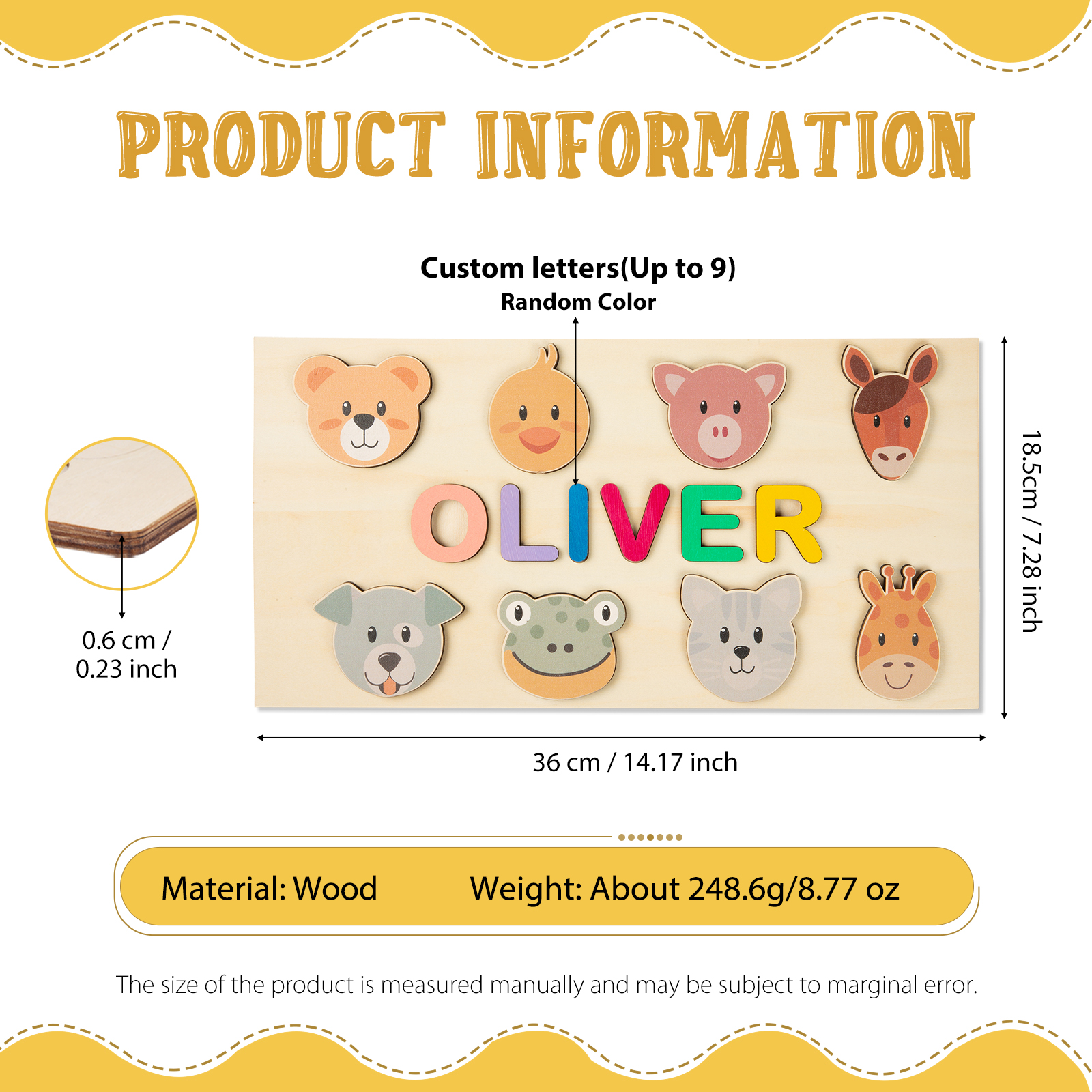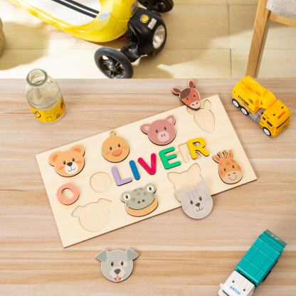 Personalized Wooden Name Puzzle, Custom Animals Wood Puzzle with Kids Name-Wooden Pegged Puzzles Educational Toy Gift for Toddlers/ Preschool Children Alphabet Early Learning