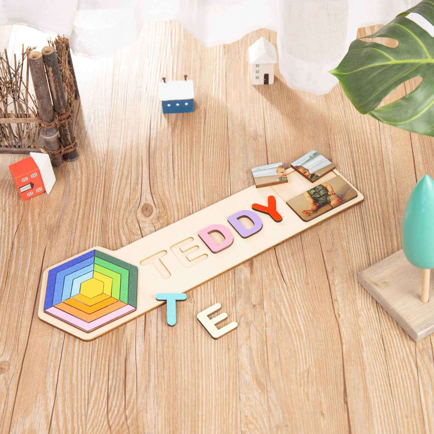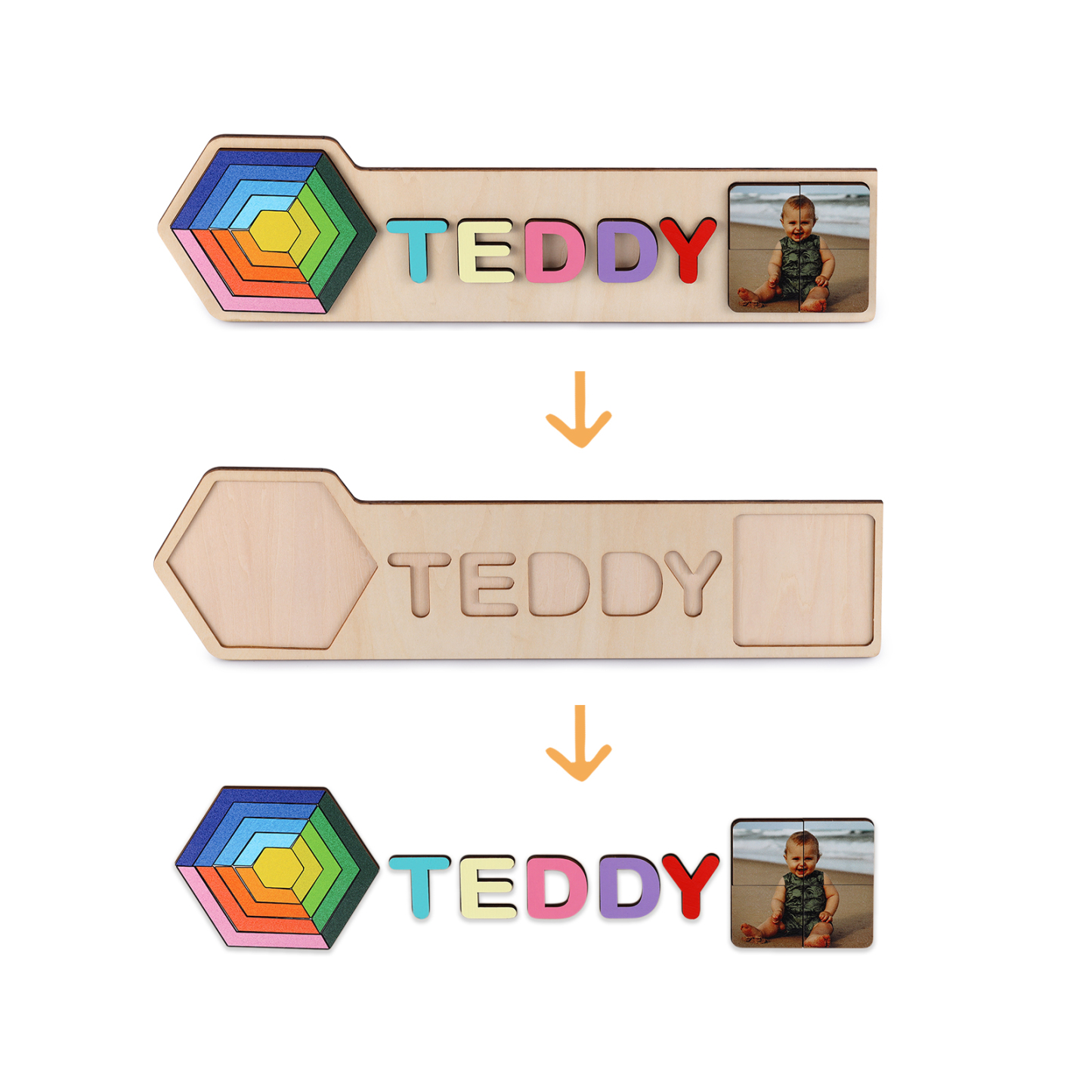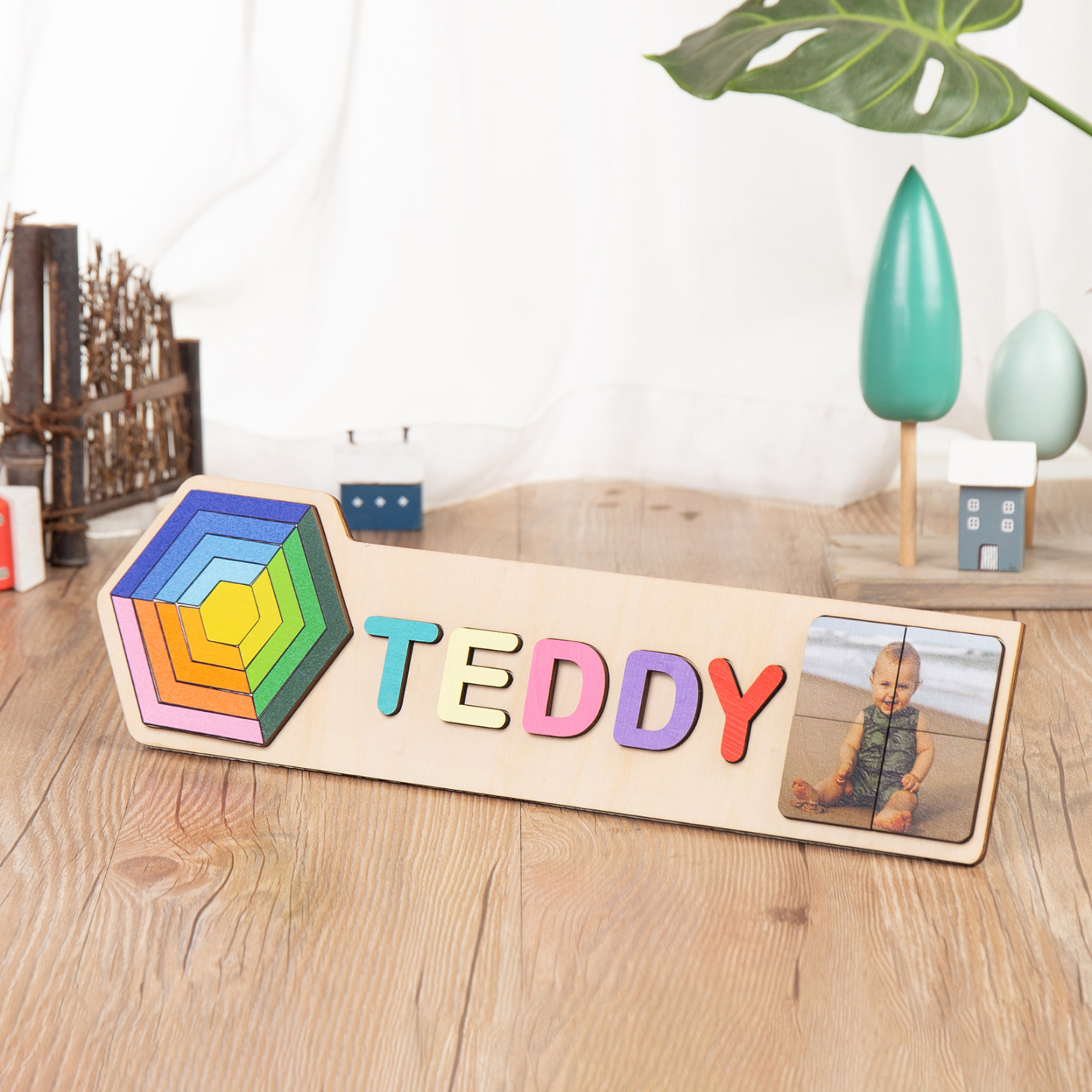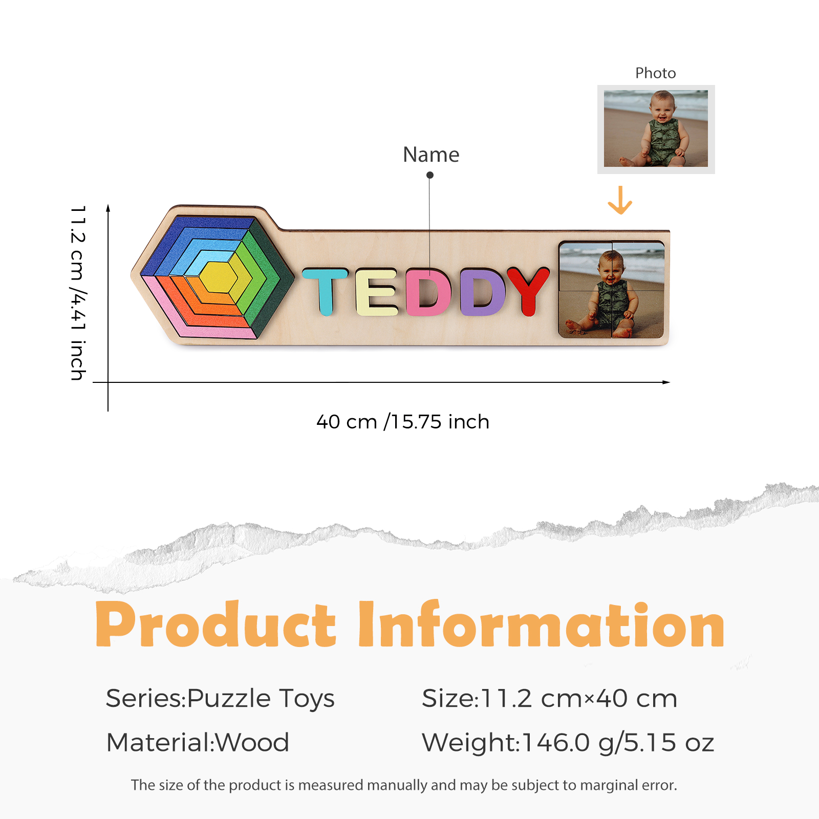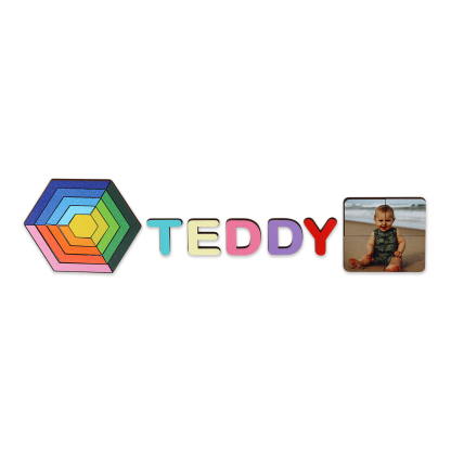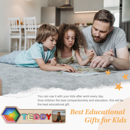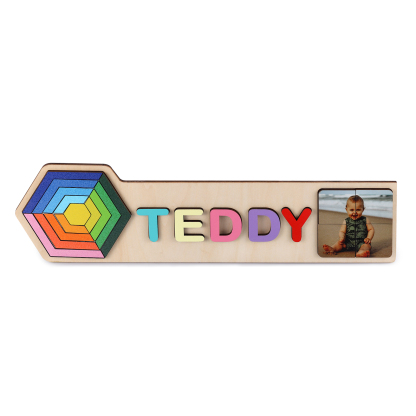 Personalized Wooden Photo Name Puzzle, Custom Rainbow Hexagon Wood Puzzle with Kids Name-Wooden Pegged Puzzles Educational Toy Gift for Toddlers/ Preschool Children Alphabet Early Learning
