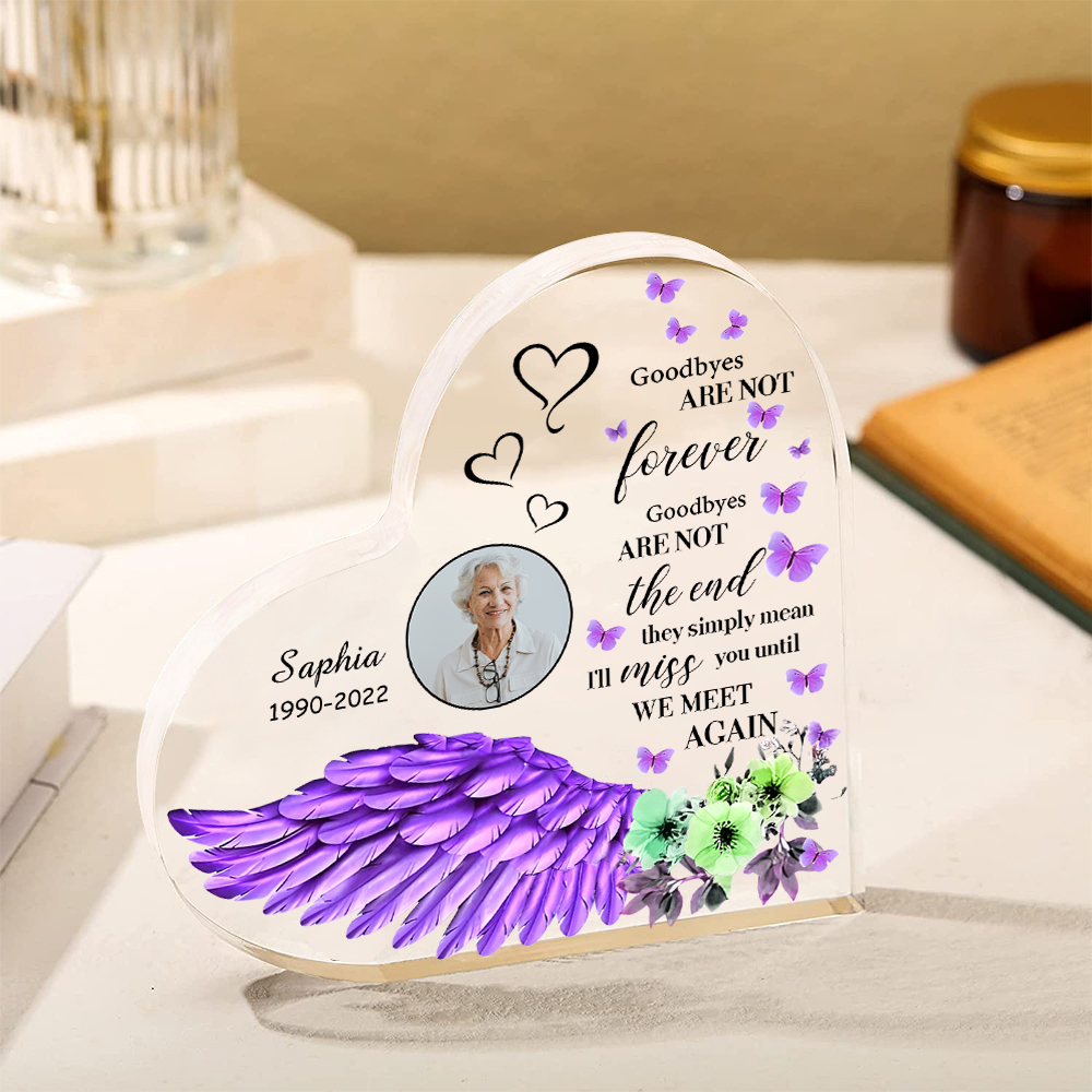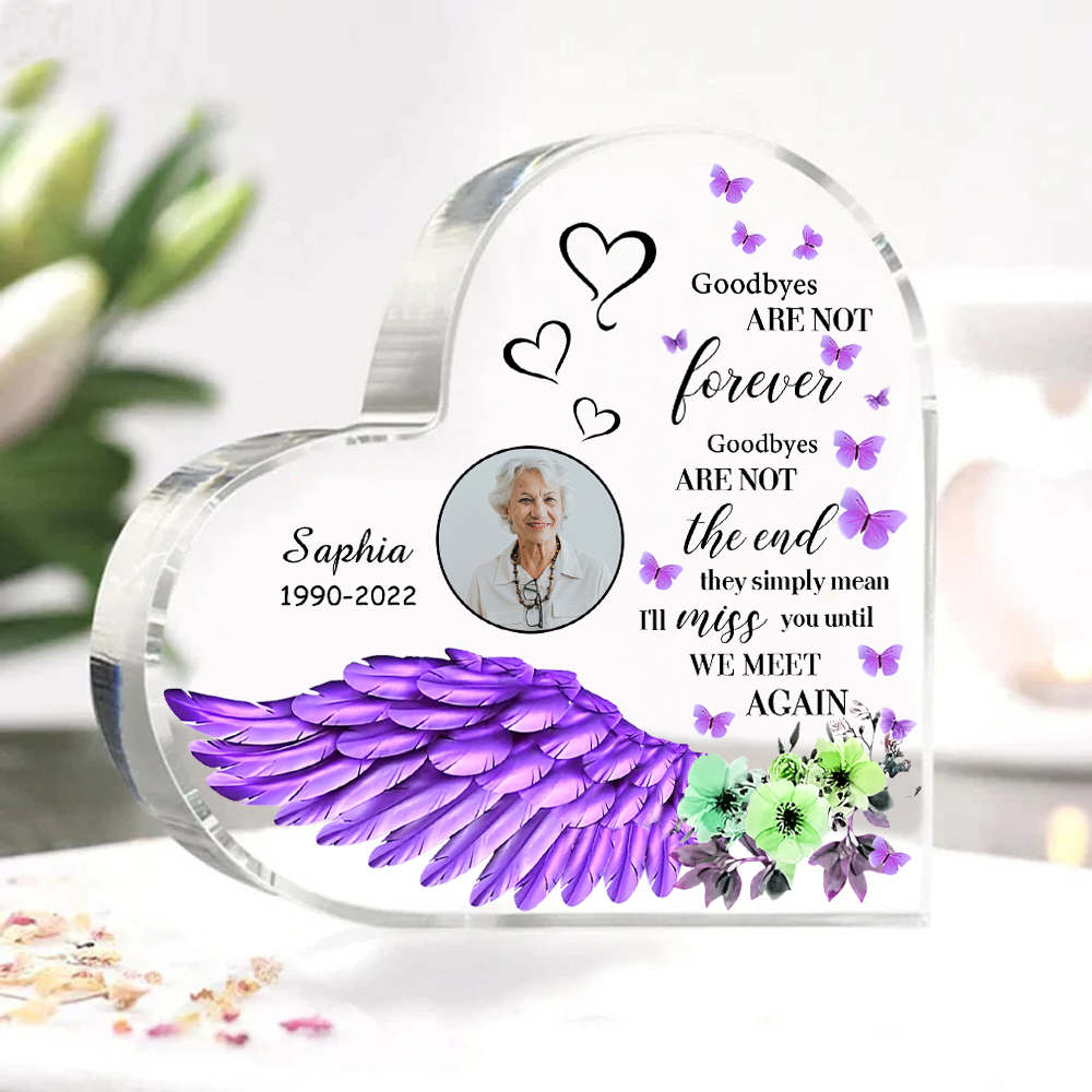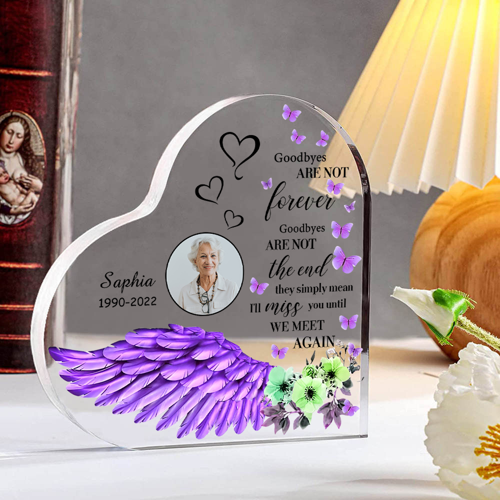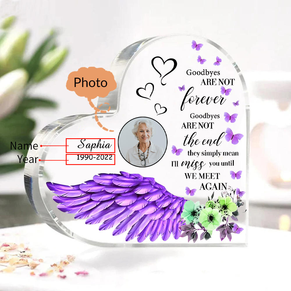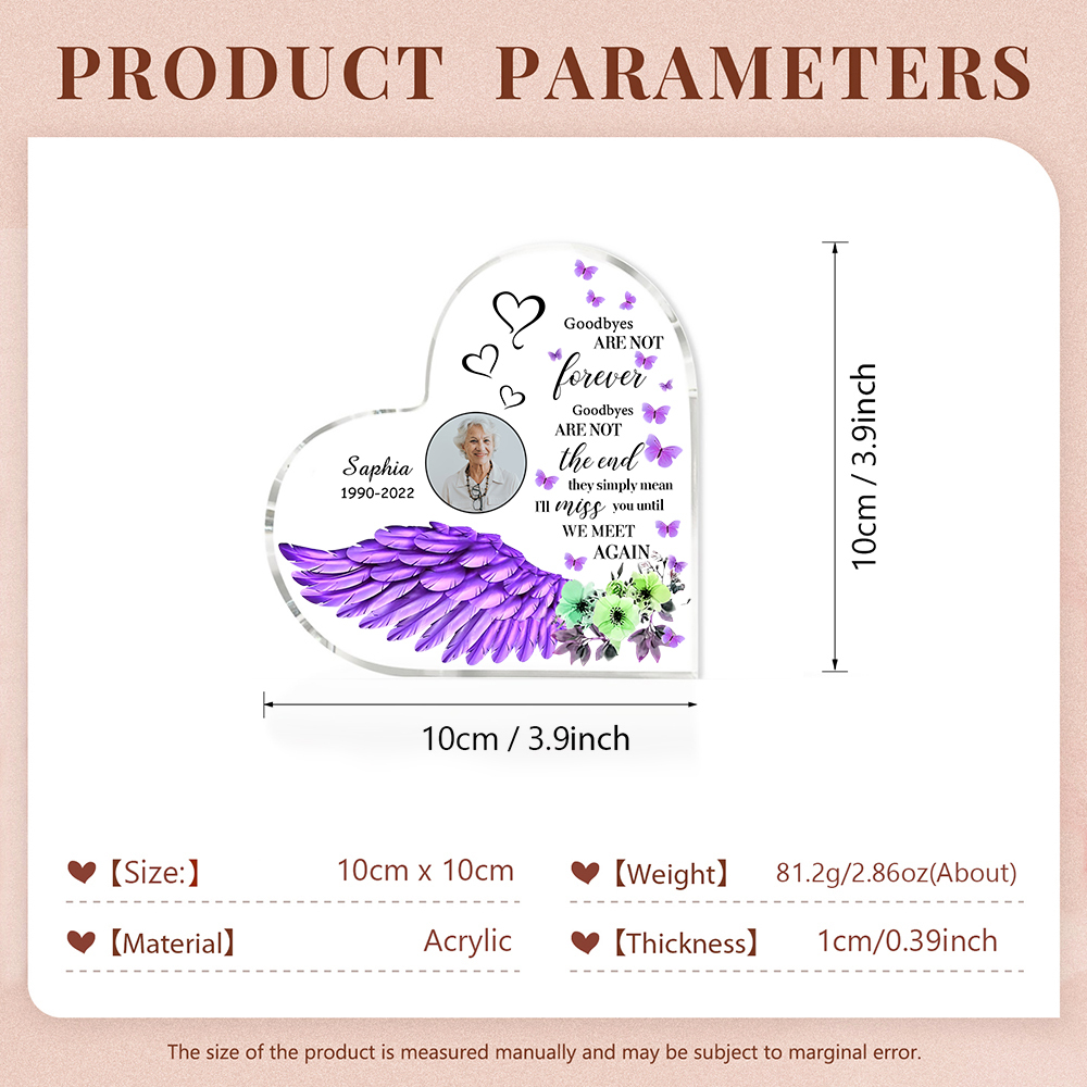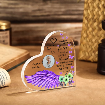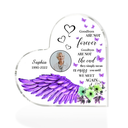 Purple Angel Wings-Personalized Memorial Acrylic Heart Keepsake Desktop Ornament-Goodbyes Are Not The End