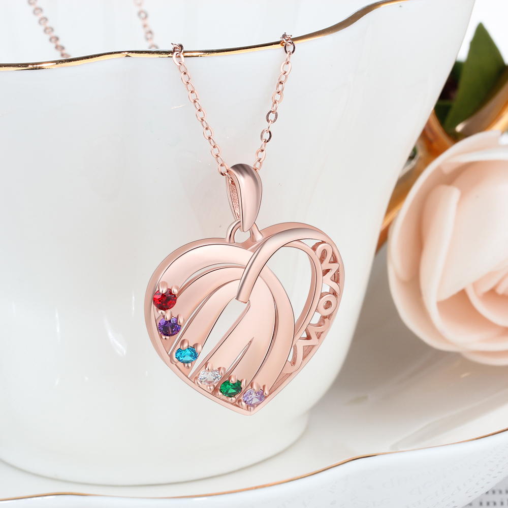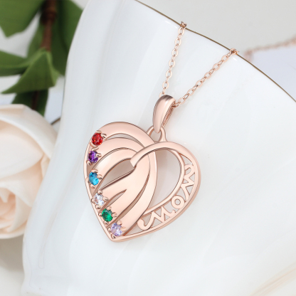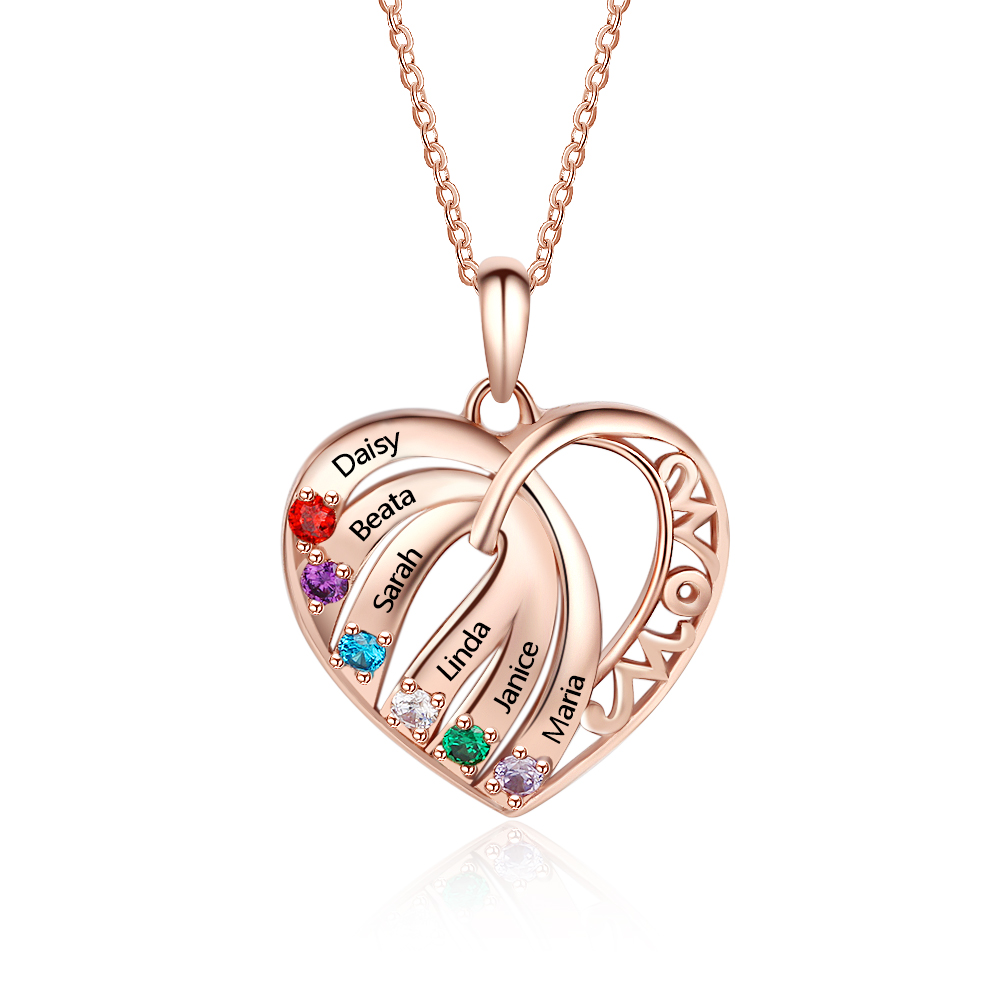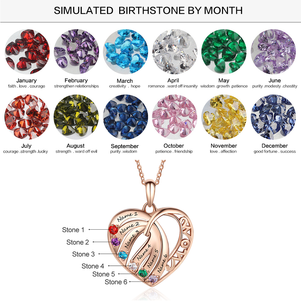 Personalized Heart Necklace With 6 Birthstones Engraved Names Gift For Her