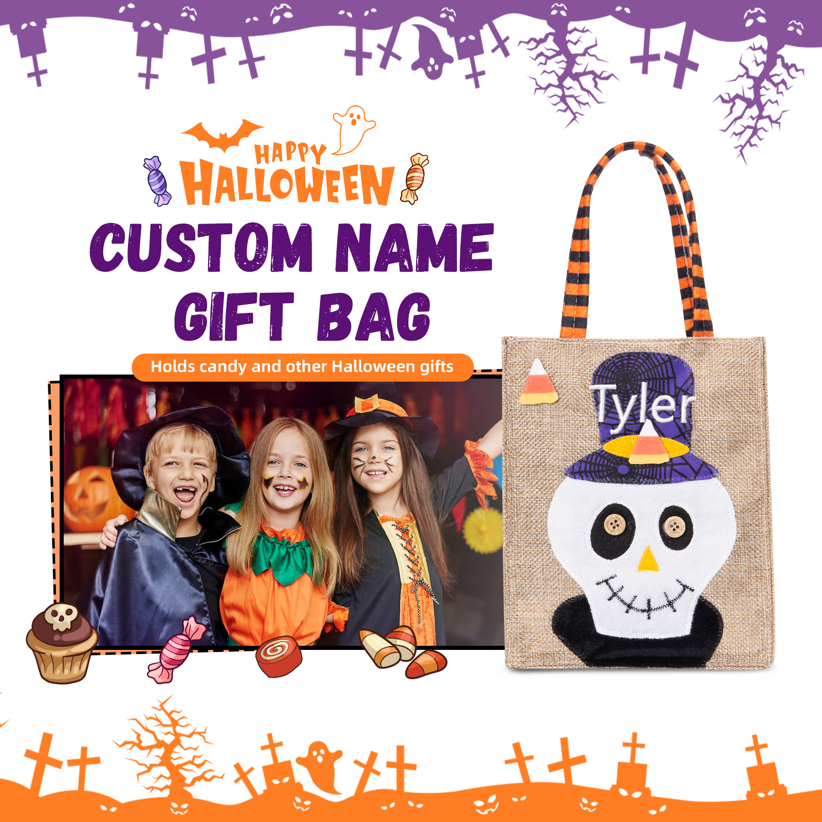🎃Introducing our latest Halloween Candy Bag, now available with customizable names! This spooktacular candy bag is the perfect accessory for trick-or-treating and Halloween parties. Made from durable materials, it ensures your candies stay safe and secure throughout the night.