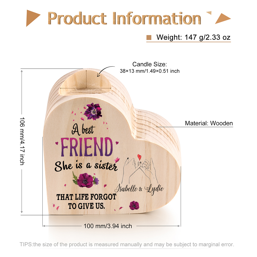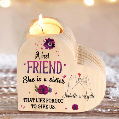 To My Best Friend Violet Flower Heart Candle Holder "She's a sister that life has forgotten to give" Wooden Candlestick