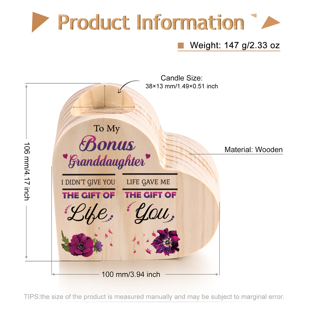 To My Bonus Granddaughter Violet Flower Heart Candle Holder "Life Gave Me The Gift of You" Wooden Candlestick
