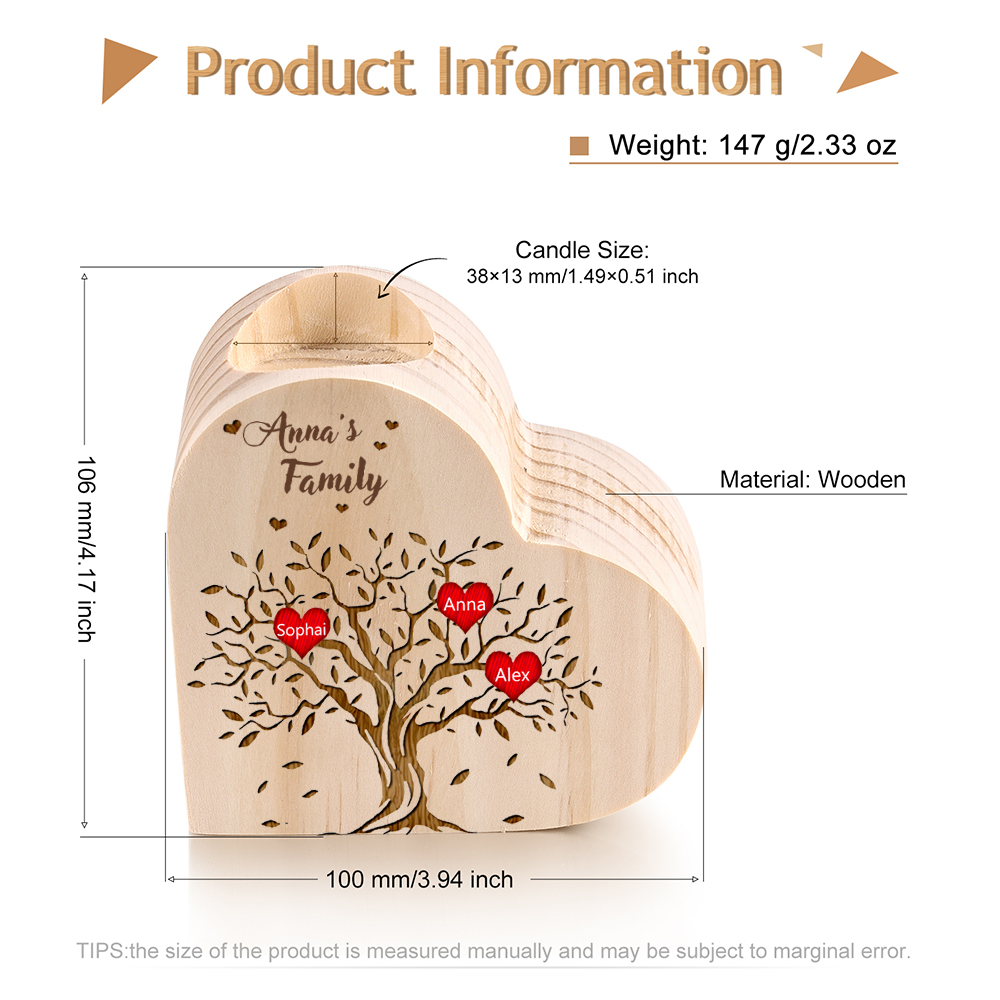 To My Family Wooden Heart Candle Holder Custom 3 Names Family Tree Candlesticks
