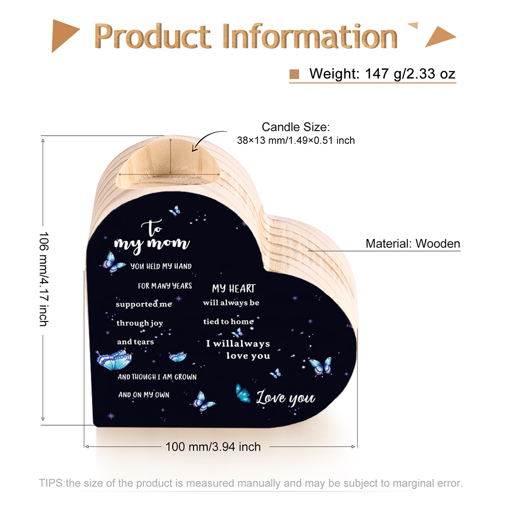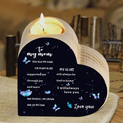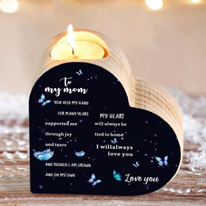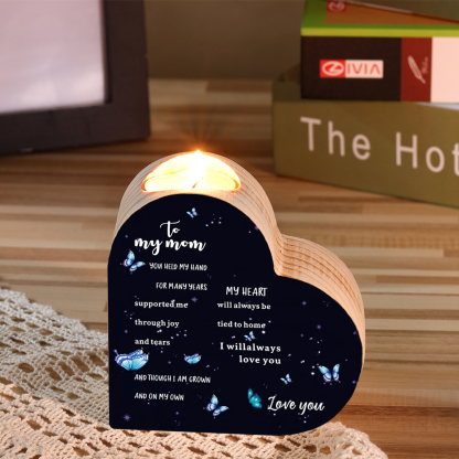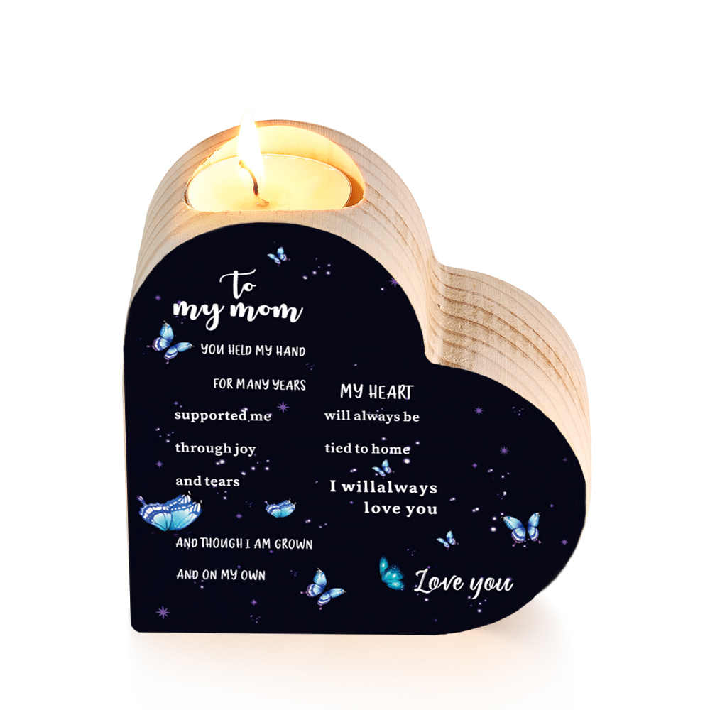 To My Mom-Wooden Heart Candle Holder Butterfly Candlesticks "always be tied to home" Gifts For Mother