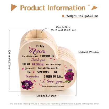There are many ways to express your special feelling to your nan, you can light this candle and tell her how special she is to you. The message is laser engraved on wood to last forever. A perfect keepsake she will love.