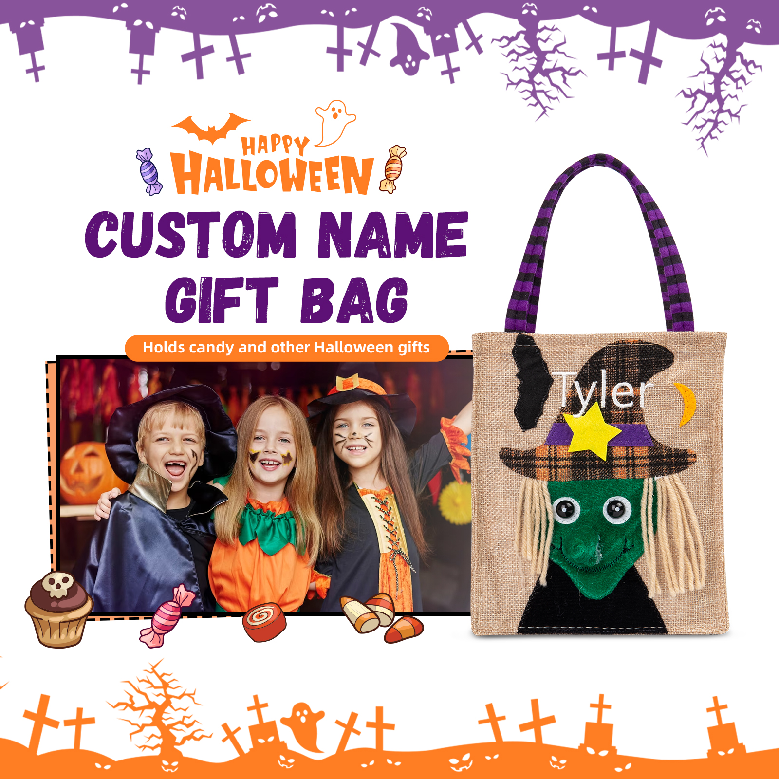 With our unique customization option, you can add your desired name to make this candy bag truly one-of-a-kind. Whether it's your own name, a spooky moniker, or a fun nickname, personalizing your candy bag adds an extra touch of Halloween magic.